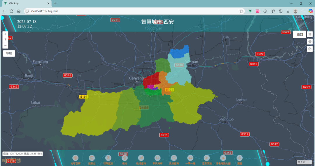 集成功能入口,可快速切换图层、调整地图视角、开启/关闭动画效果,能够呈现西安市的人口数量,医疗设施,高校等信息,提升操作便捷性和获取信息的速度。