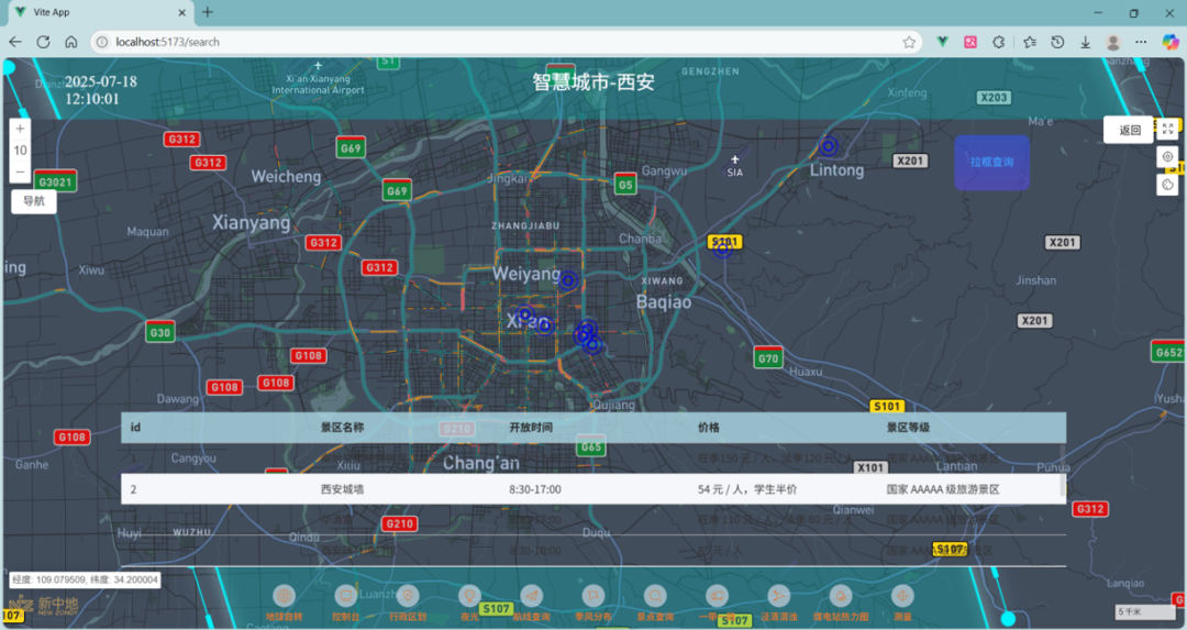 整合西安市景区数据,通过拉框选择功能,绘制所要查询的范围即可在下边列表中呈现,查询指定区域内的景区列表,方便游客与管理者快速获取信息。