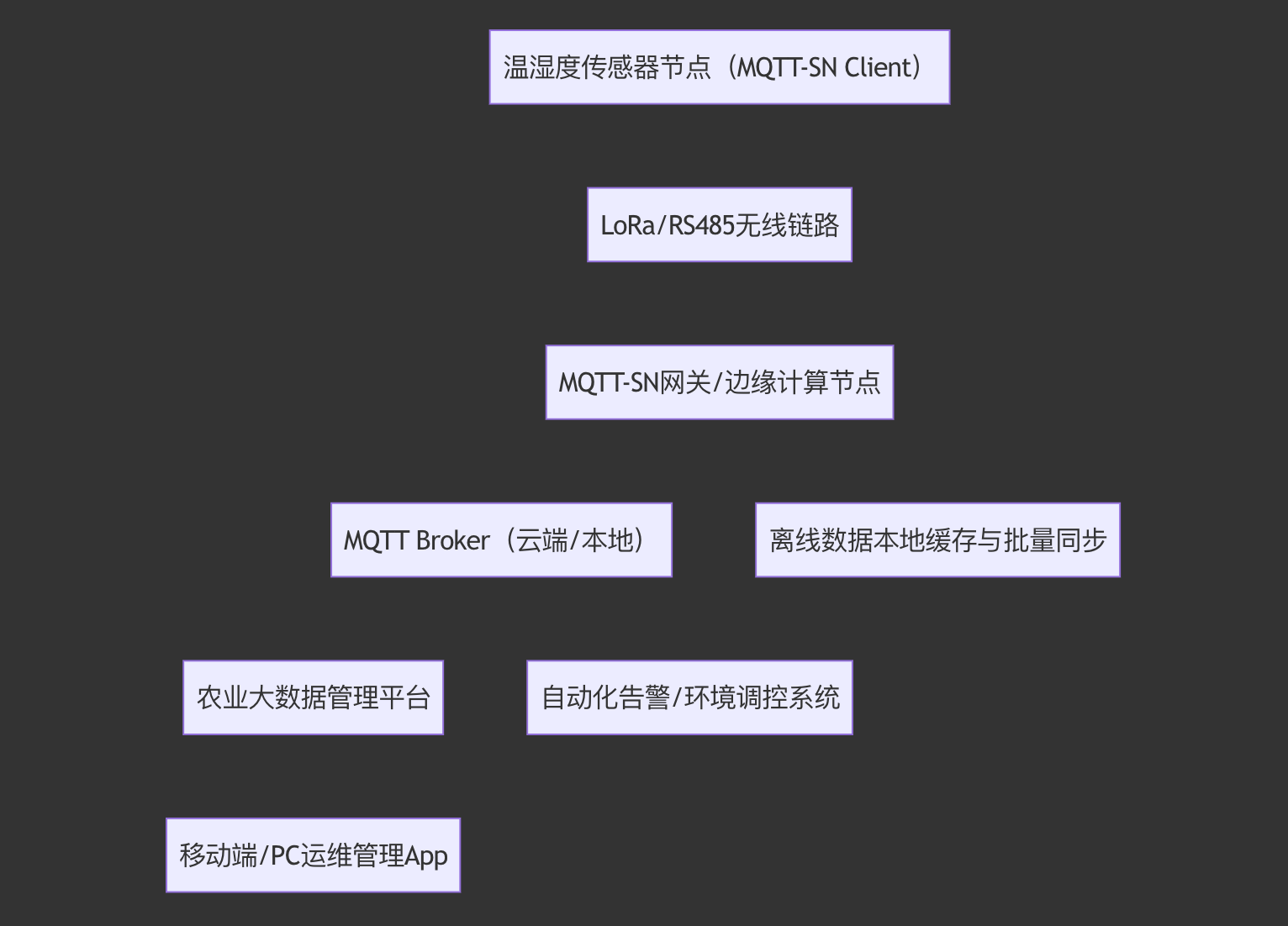 通过MQTT-SN协议,这些节点以极低能耗周期性唤醒并上报数据,网关统一汇聚、转换并转发到云平台,实现大范围、低成本、易维护的环境数据采集。