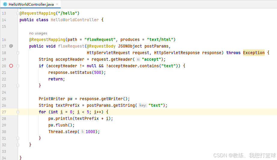 http 服务这边的处理如下, 处理也非常简单, 就是 每一秒输出一行内容, 然后持续 5秒