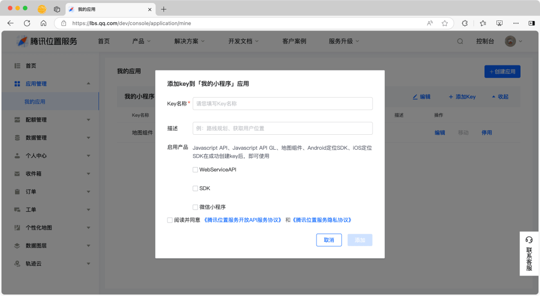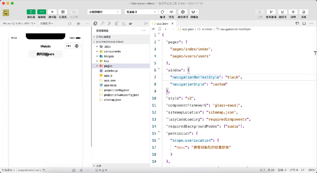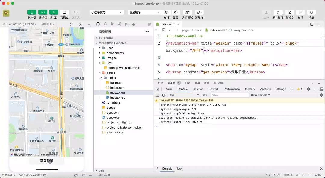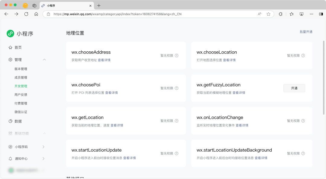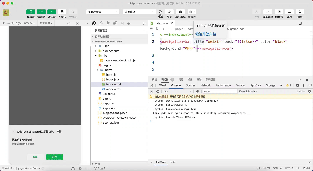 对于正式项目,若想使用位置 API,需要在微信小程序管理后台申请接口权限、填写用户隐私保护指引,并在微信小程序全局配置文件(app.json)添加隐私声明。