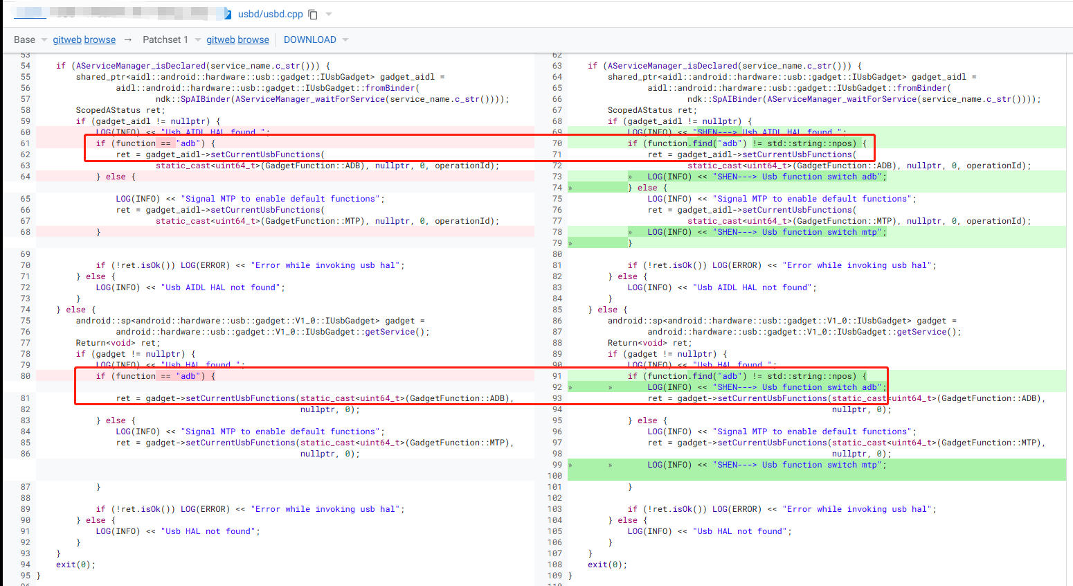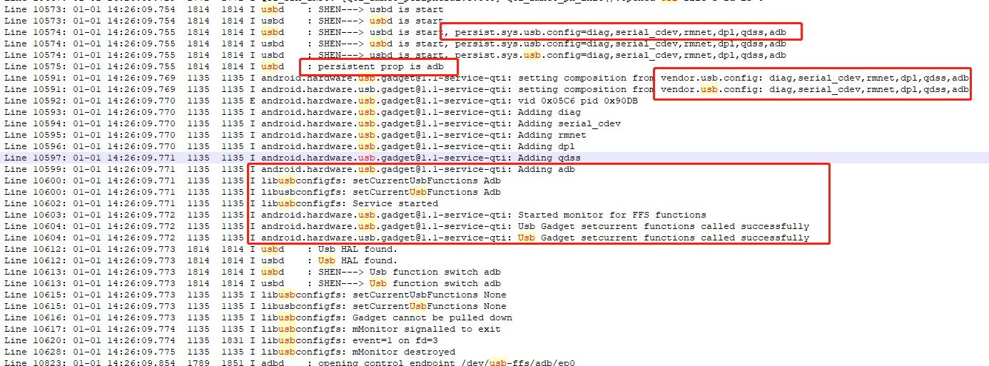 针对如上情况,persist.vendor.usb.config定制为diag,serial_cdev,rmnet,dpl,qdss,adb,但是在开机动画阶段确没有adb,这个情况感觉个人觉得不是很合理,明明包含adb,为什么usbd判断出来非adb呢?因此针对usbd进程做了如下的修改: