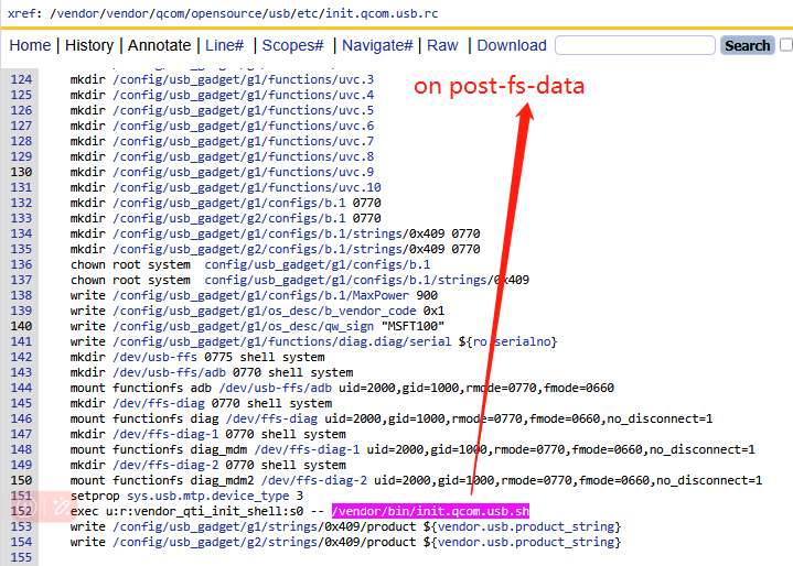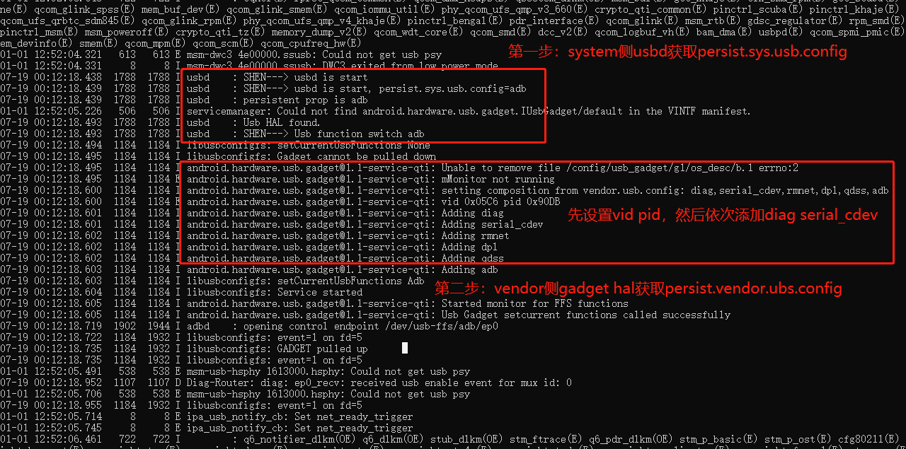 - persist.vendor.usb.config默认在init进程的on-post-fs-data阶段启动init.qcom.usb.sh脚本设置为diag,serial_cdev,rmnet,dpl,qdss,adb