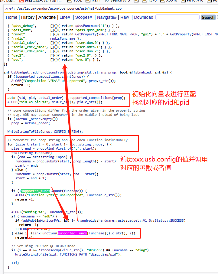 高通特有的diag功能,就在该属性值上面进行扩展为"diag,adb"或者"diag"的ADB,因为这是高通自己加的,所以GadgetFunction里面是不可能存在的。高通的做法就是在UsbGadget HAL里面进行适配,那么如何适配的,请参考setCurrentUsbFunctions函数。