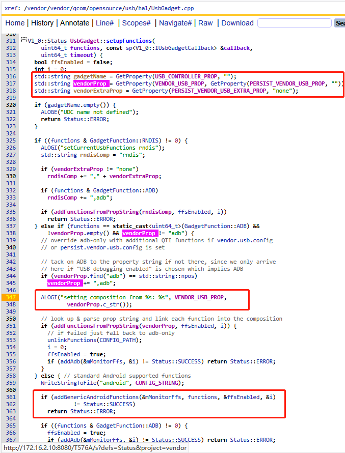 aosp标准的GadgetFunction::ADB对应属性值为adb,这个是aosp和高通都支持配置