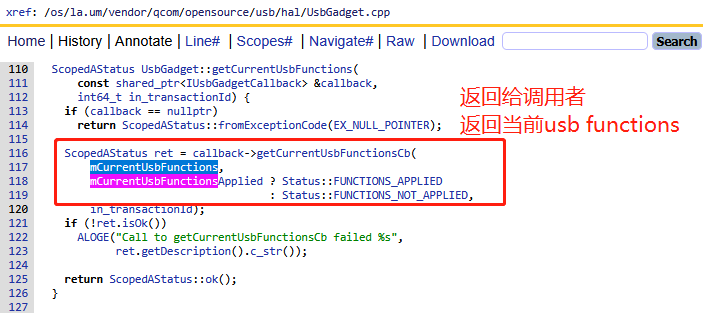 ScopedAStatus ret = callback->setCurrentUsbFunctionsCb(functions, Status::SUCCESS, in_transactionId); //回调给客户端