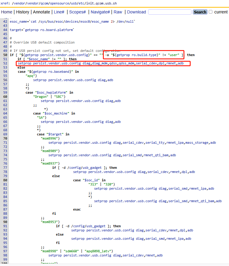 此属性在MTK平台不存在,主要是在高通平台上面,高通平台通过一个sh脚本主动去设置初始值,如果是debug版本就主动设置为diag,diag_mdm,qdss,qdss_mdm,serial_cdev,dpl,rmnet,adb,后续根据高通不同平台去设置不同的值,可能高通不同芯片架构支持的能力不一样。