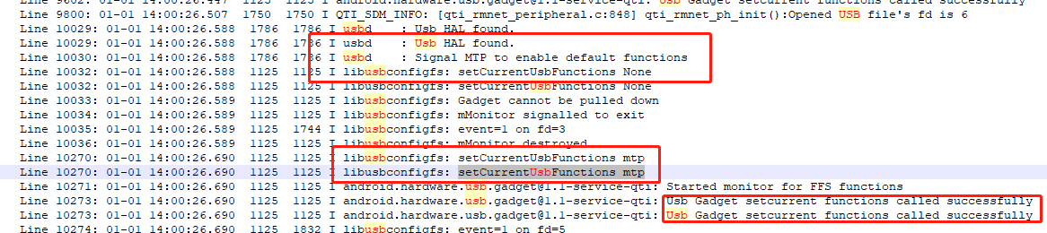 此时在开机动画阶段,usbd进程启动的时候就不会进入mtp流程,而是直接切换为adb功能,adbd就不会在开机动画过程中中断,如下日志: