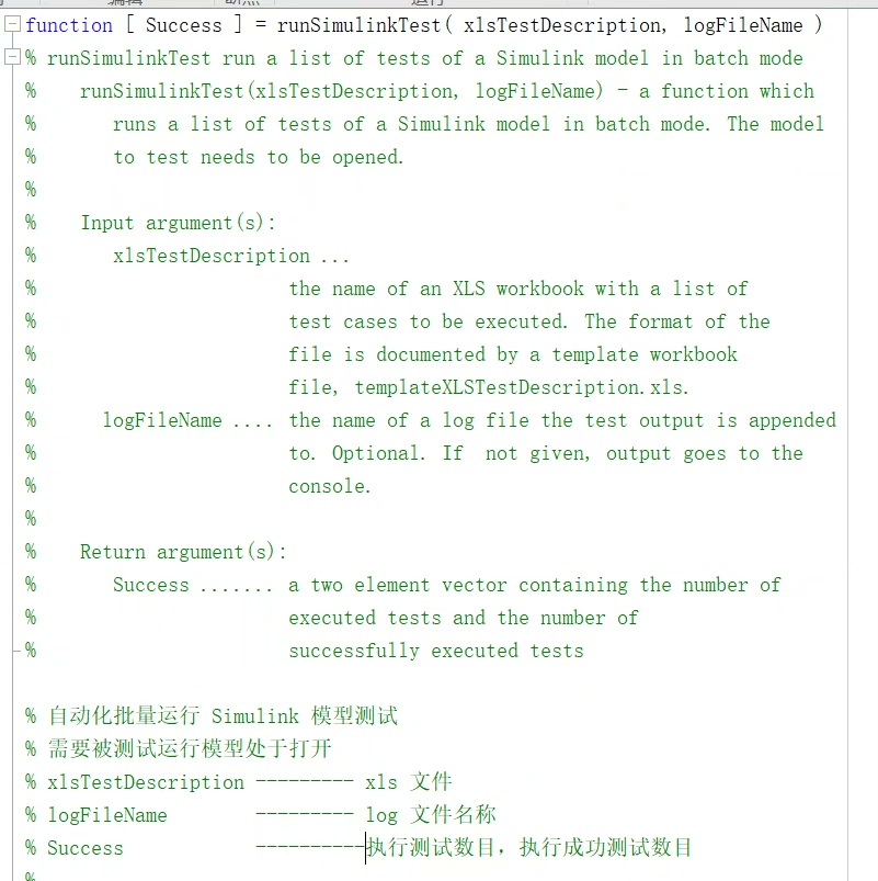 Simulink简易自动化测试工具,批处理运行模型,能够实现模型简易仿真多次反复测试,简化手动重复配置参数,运行模型,保存结果的烦恼!已经过FEV大厂已经过多次验证,工具可靠稳定。 该工具箱能够对一个Simulink反复运行多次(每个测试 case可在Excel文件中配置各种参数),并保存运行结果到mat文件。 然后对比结果命令,得出是否测试通过或未通过的结论。 以上所有操作均为自动化进行,运行过程中产生的提示或错误信息均记录在程序运行结束输出的log文件中。 所有模型信息和参数配置简化为Excel文件中配置,需要写入批处理运行的模型名称,每次运行模型需要修改的初始化参数(模型用到的参数),需要加载的mat数据文件,以及Simulink运行参数配置(例如仿真时间,步长等)。 运行模型过程中的报错信息也能记录在log文件中,当模型出现问题可以查看log文件中提示内容。 所有代码均为m脚本,全部开源,涉及到excel文件读取,log文件记录,自动化控制simulink运行,自动化控制matlab设置参数,配置simulink参数,信号结果保存,模型测试结果验证。 该程序已经过FEV大厂已经过多次验证,工具可靠稳定。 注意,该工具需要提前搭建simulink模型和初始化参数文件。 送工具的详细说明使用方法,可进行,保证您的模型自动化运行测试任务。 使用方法: 首先在 Excel 文件中配置测试需求,即需要运行模型的次数,以及每次运行模型需要配置的初始化参数、加载的mat文件、以及其他命令等,都可在Excel中配置。 然后调用工具函数即可开始自动化运行模型测试。