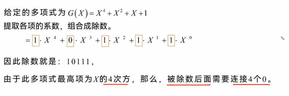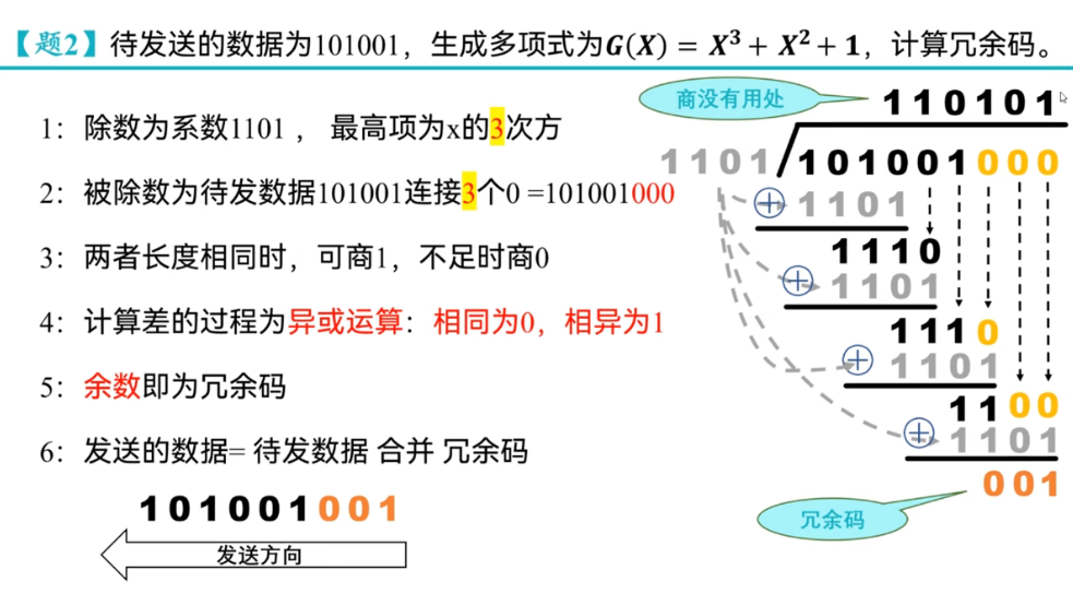 2.发送方基于待发送的数据和生成多项式相除,计算出余数--差错检测码(冗余码)