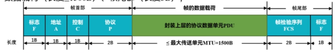 PPP协议的帧格式:帧首部(长度5B)、数据载荷(长度≤1500B)、帧尾部(长度3B)