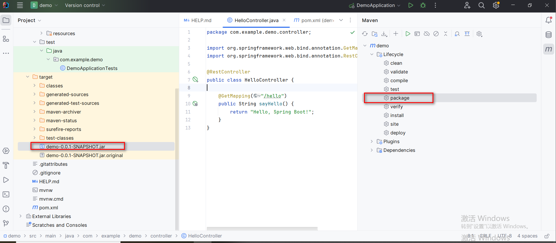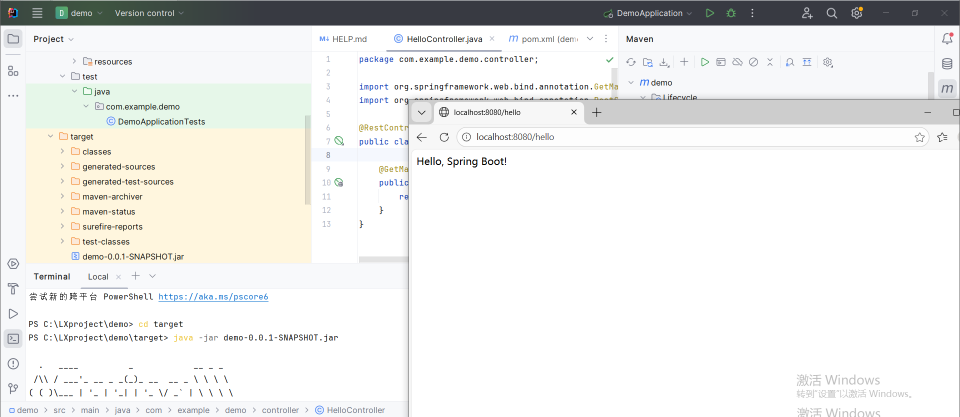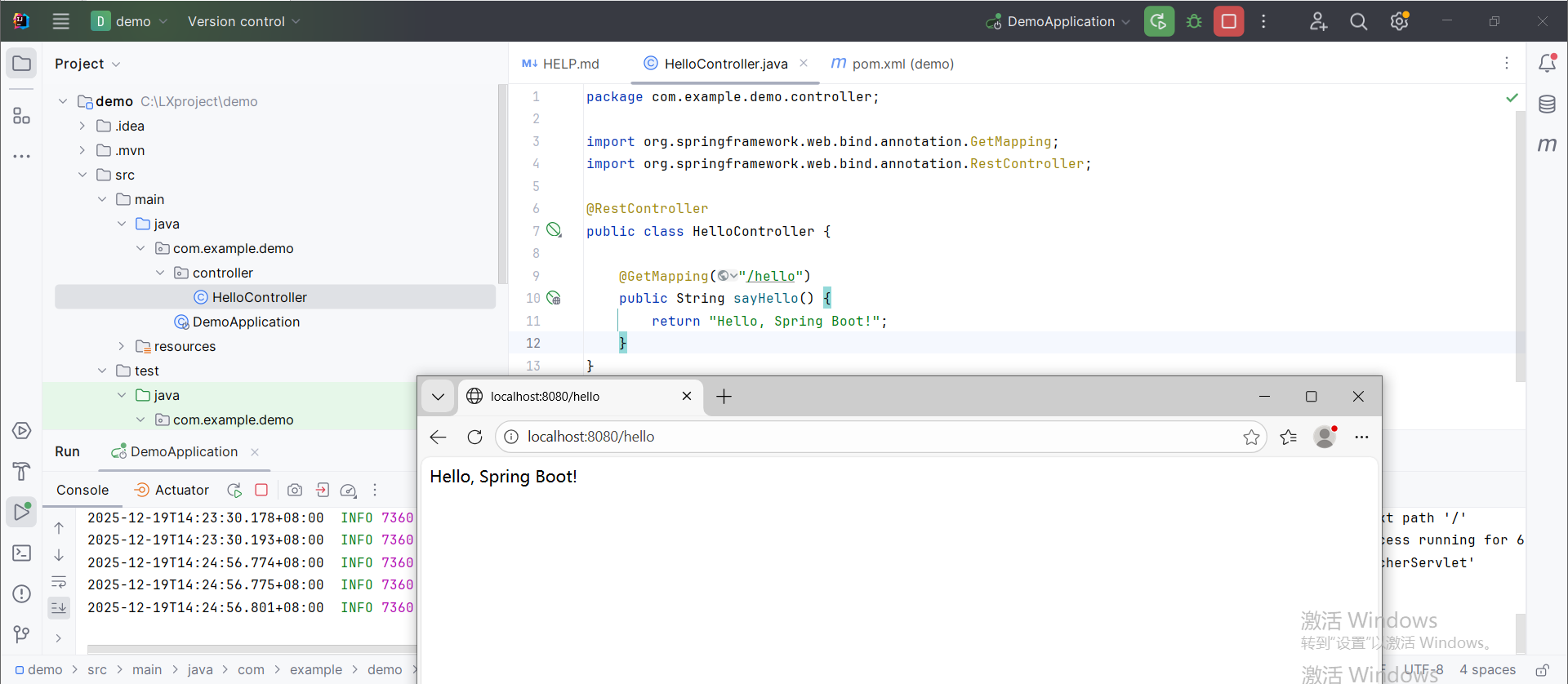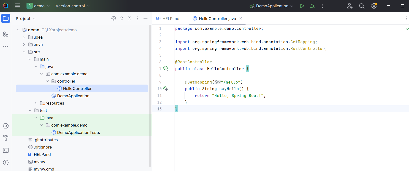 HelloController.java:javapackage com.example.demo.controller; import org.springframework.web.bind.annotation.GetMapping; import org.springframework.web.bind.annotation.RestController; @RestController public class HelloController { @GetMapping("/hello") public String sayHello() { return "Hello, Spring Boot!"; } }