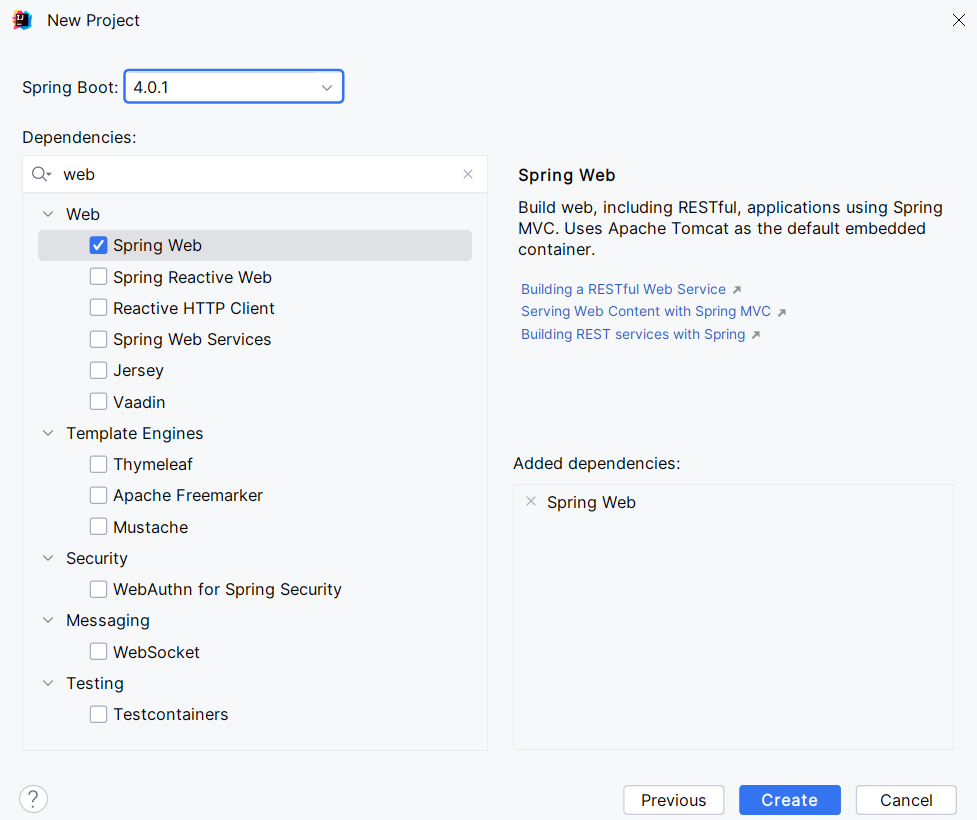Spring Web用于构建 REST API)。 - 例如,勾选 Spring Web → 点击 Next 。