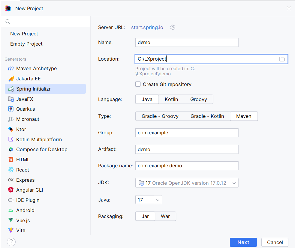 - Default(官方 Spring Initializr) 或自定义 URL。