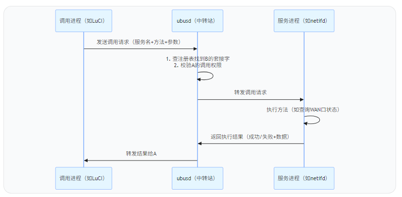 UBUS 是为嵌入式设备优化的本地 RPC 框架(仅支持单主机内的进程调用),其 RPC 流程可简化为: