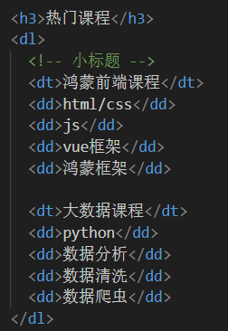 用dl创建列表,dt表示下定义(小标题),dd表示对定义内容补充