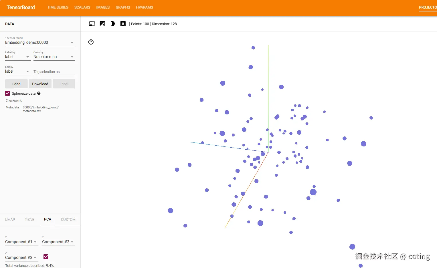 在模型训练结束后,我们可以用 TensorBoard 来查看高维向量的分布(常用于可视化词向量、图像特征):