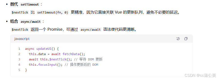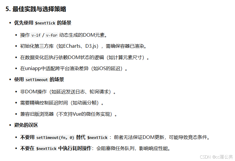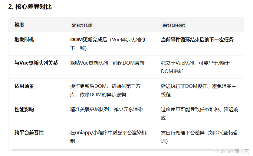 $nextTick比setTimeout(fn, 0)更精准,因为它直接关联 Vue 的更新队列,避免不必要的延迟。