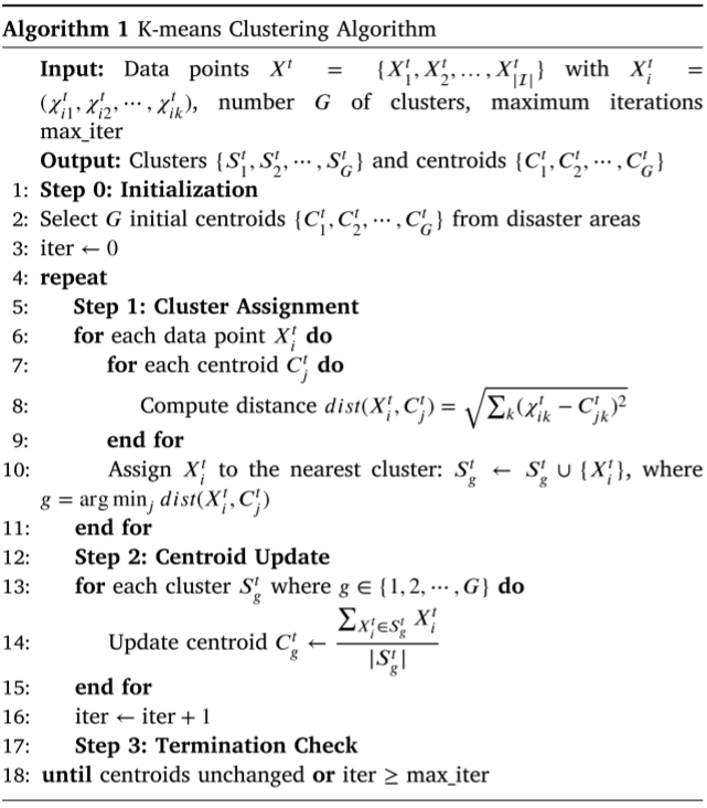 基于多指标应急属性,本文采用 K-means 聚类算法对灾区进行优先级分组。通过属性标准化与群组评价指标计算灾区紧迫度,并据此确定群组优先级参数,最终将灾区划分为紧急区与次紧急区,为应急物资分配提供快速、量化的决策依据。