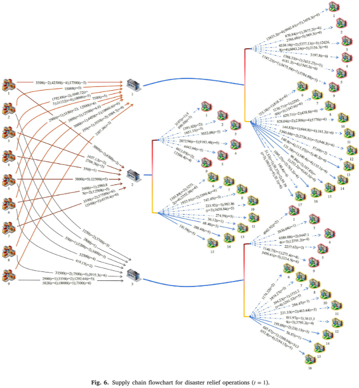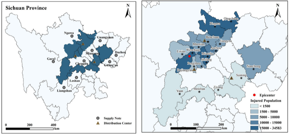 案例中采用无人机与卡车协同运输,区分耐用品与消耗品两类物资,并在寒冷条件下提高耐用品的重要性权重。基于灾区位置、受灾程度及供应网络信息,构建了简化的应急物流网络,对模型在大规模灾害快速响应场景下的可行性与实用性进行了验证。