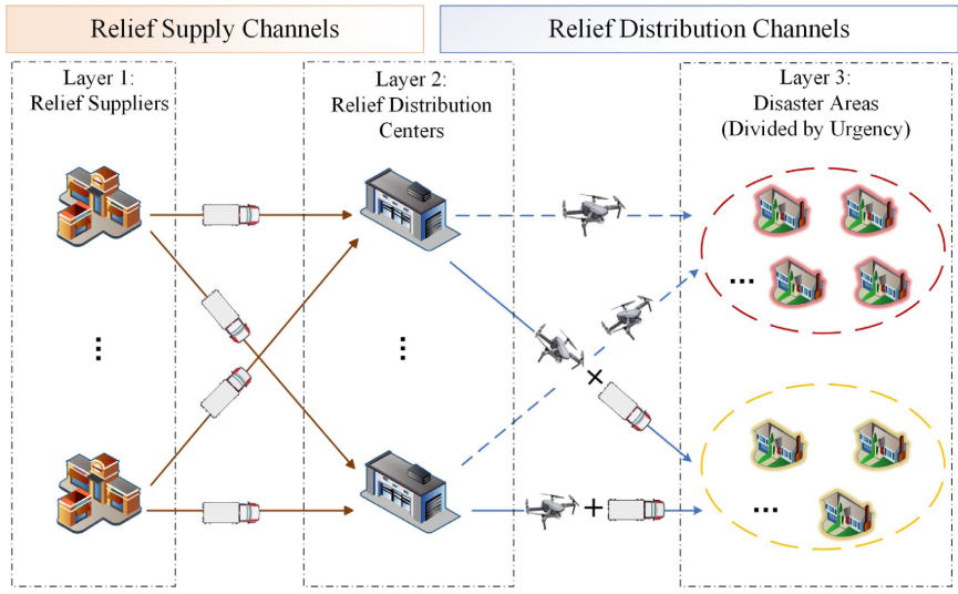 本文构建了一个由救援物资供应商---配送中心---灾区组成的三层应急物流网络,目标是在动态需求环境下最小化总体运营成本并降低最大物资短缺率。灾区根据受灾严重程度被划分为紧急区与次紧急区,其中紧急区优先获得救援资源配置。灾情紧急程度的评估基于多指标综合判定,以适应不同灾害类型的特性。在运输层面,引入无人机--卡车混合运输模式:紧急区优先采用无人机配送以满足时效性需求,次紧急区由剩余无人机与卡车协同服务,从而实现资源的高效与公平分配。为实现灾区优先级的科学划分,本文采用 K-means 聚类算法对灾区进行分级,并据此计算群组优先级参数,为后续救援调度与优化决策提供依据。