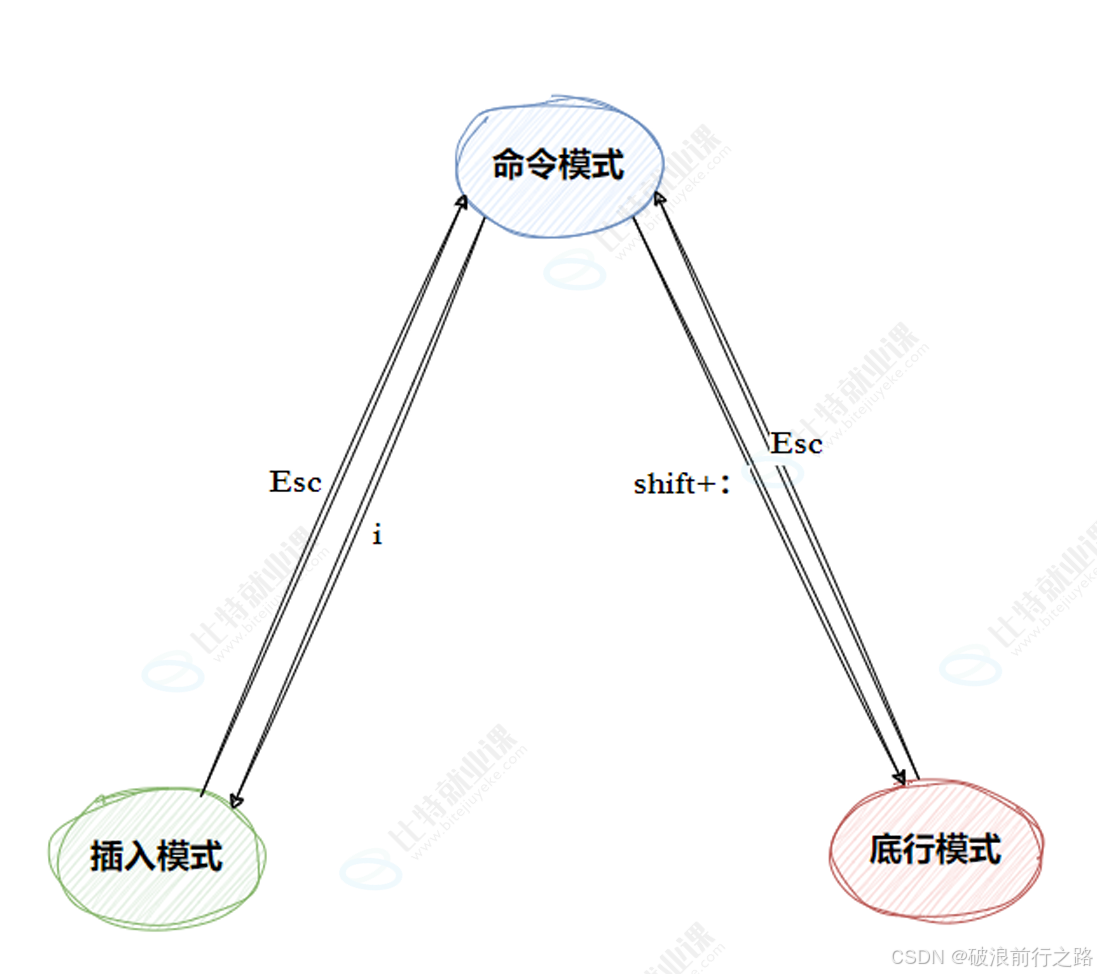 课堂上我们讲解vim的三种模式(其实有好多模式,⽬前掌握这3种即可),分别是命令模式(command mode)、插⼊模式(Insertmode)和底行模式(lastlinemode),各模式的功能区分如下: