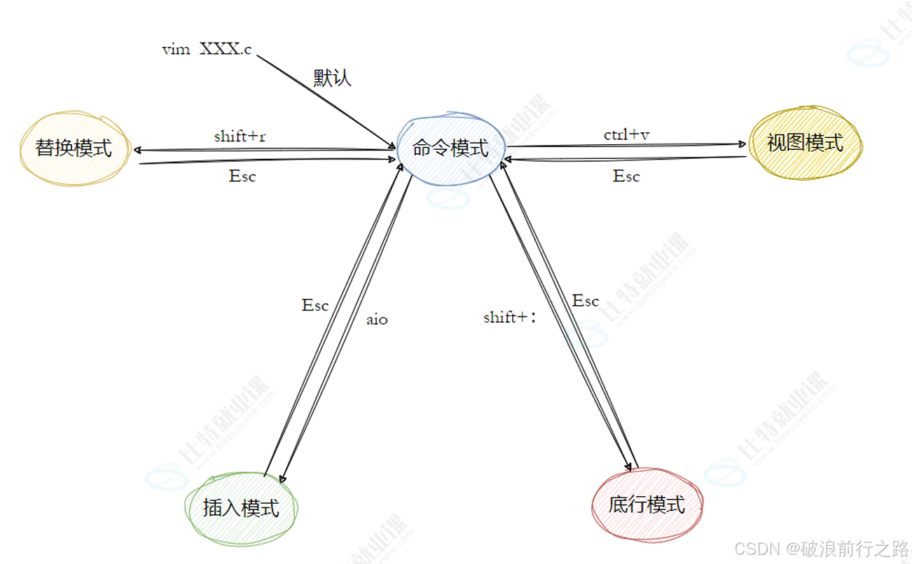 插入模式:用于文本输入,按 i 进入插入模式,按 Esc 可以返回普通模式,此模式下可以进行代码编写