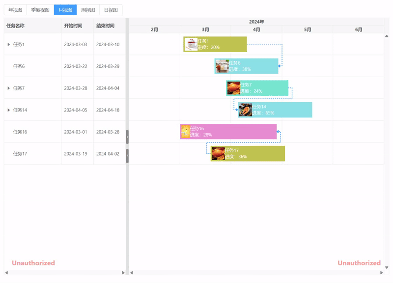 { id: 10006, title: '任务6', start: '2024-03-10', end: '2024-03-21', progress: 5 },