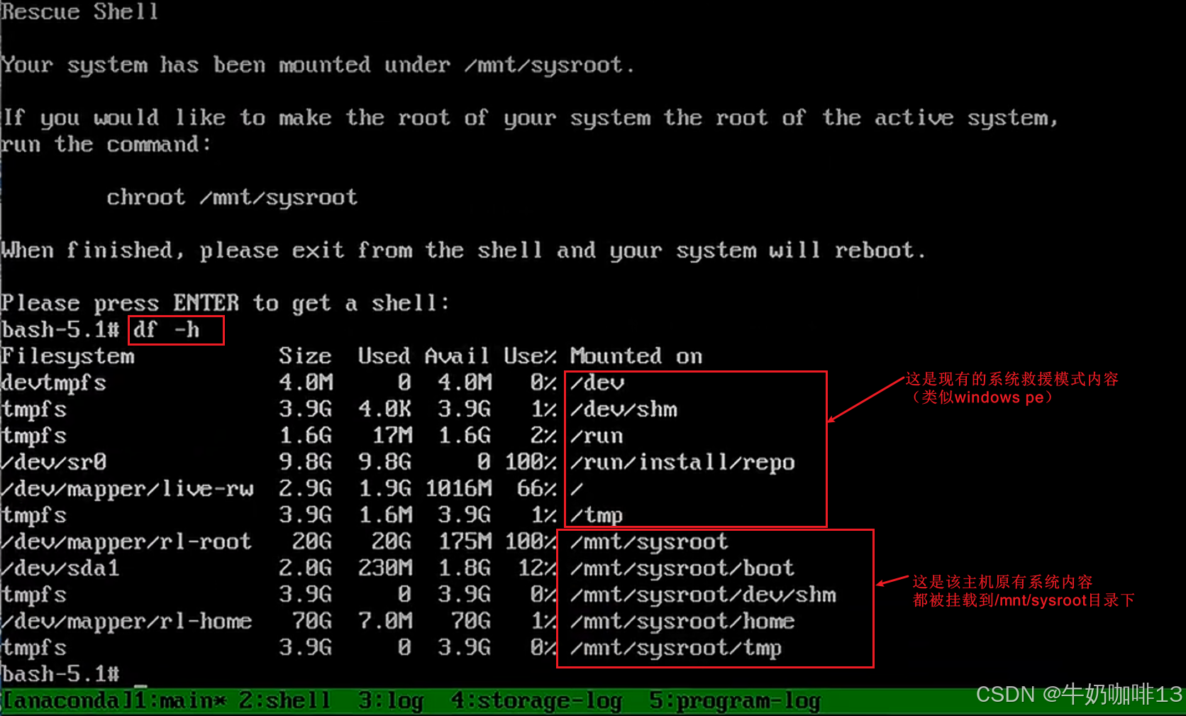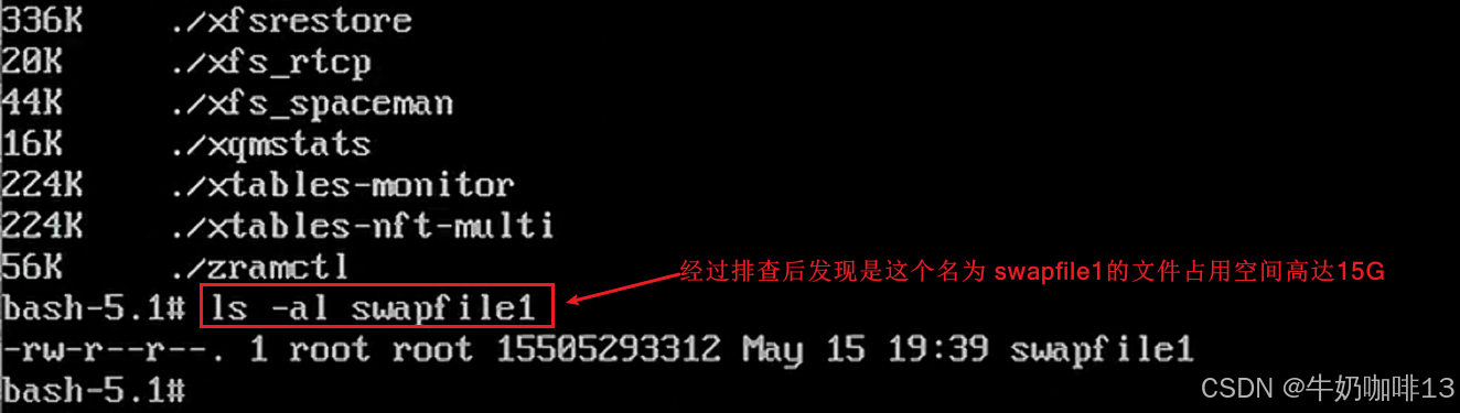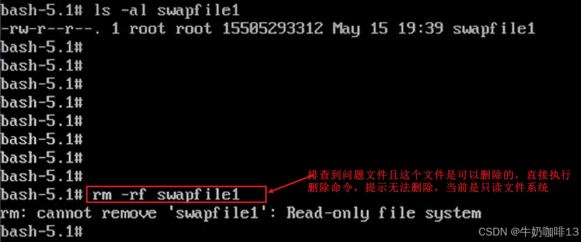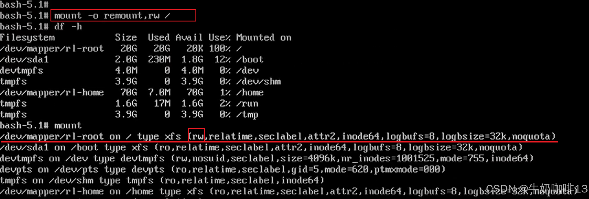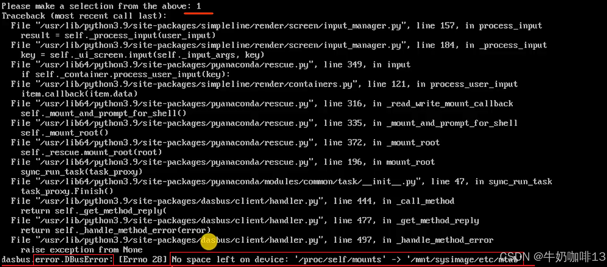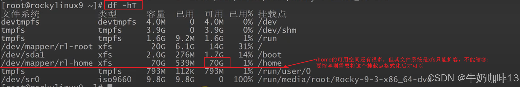 FAILED\] Failed to start GNOME Display Manager. See 'systemctl status gdm.service' for details. "的错误信息,如下图所示:  ## 二、思路分析 ### 2.1、系统无法正常启动的常规思路 一般来说,系统无法正常启动,我们都可以使用该系统的iso镜像文件通过系统启动U盘或PXE引导进入【系统救援模式】中来分析查看具体的错误详情。进入系统救援模式的步骤: 《1》主机上电后不停按下F2键选择系统启动U盘或PXE启动进入引导菜单后选择【Troubleshooting】后按下Enter键--\>【Rescue a Rocky Linux system】后按下Enter键--\>输入【1】后按下Enter键以读写模式进入系统救援模式,可以看到错误信息"dasbus.error.DBusError: \[Errno 28\] No space left on device: '/proc/self/mounts'-\>'/mnt/sysimage/etc/mtab'"(即:设备没有空间,内容没法写入和操作,因为没有存储空间导致系统不能正常启动进入的,只有一种情况就是根分区的空间满了,其他分区的空间满了对于系统启动没有什么影响;既然现在以读写模式进入系统救援模式后无法操作,那我们就以只读模式进入系统救援模式在操作看看)。 《2》重启主机后一样的操作不停按下F2键选择系统启动U盘或PXE启动进入引导菜单后选择【Troubleshooting】后按下Enter键--\>【Rescue a Rocky Linux system】后按下Enter键--\>在系统界面输入【2】后以只读模式进入系统救援模式(模式是两套系统【救援模式的系统类似windows pe】【本主机的原有系统被挂载到 /mnt/sysroot 目录下】;若想要将原系统如正常启动的系统一样的挂载使用则运行 chroot /mnt/sysroot 命令即可);执行【df -hT】可以查看系统当前的所有内容挂载情况(可以看到该主机的原系统根分区使用是100%)。       ### 2.2、系统故障分析确认 在系统救援模式下,使用【chroot /mnt/sysroot】命令切换到该主机系统上后,可以运行【df -hT】先查看所有分区的挂载与使用情况,可以看到当前系统的根分区使用率已经到达100%,与我们最开始预测的根分区满了的推测一致;接下来的操作就是排查根分区中哪个内容是占用空间较大且可以删除的即可解决问题:  ### 2.3、修复故障 排查根分区中哪个内容是占用空间较大且可以删除的: 《1》先查看根分区中占用空间的情况命令是【du -sh ./\*】; 《2》进入这个占用空间较大的目录(如/mnt)中继续执行查看占用空间情况命令【du -sh ./\*】(排查到时swapfile1文件占用空间最大到达15G,且这个文件是用作物理内存不够交换使用的,分的太大了,可以直接删除,但目前是只读文件系统,无法删除文件); 《3》既然当前有问题的根分区是以只读模式挂载的,那么修改为读写模式挂载【mount -o remount,rw /】后再执行文件删除操作即可,然后再次查看系统的所有挂载分区使用情况【df -hT】可以看到根分区已经空闲出15G空间出来使用正常了。 《4》退出当前模式【exit】并重启系统【reboot -f】查看系统是否可以启动后正常进入系统使用。        **到这里恭喜你,故障修复完成,可以成功进入系统中了。** ## 三、隐患解决 ### 3.1、系统隐患问题 虽然目前已经将根分区满的问题暂时解决了,但目前系统的根分区是不合理的(并没有将【/var】【/log】独立出来,都是糅合在根分区上)且目前根分区只有20GB,空间容量也不大,在后续的使用过程中还是会存在根分区空间又满的情况。 ### 3.2、逻辑卷LVM分区的缩容与扩容 [Linux的磁盘存储管理实操------(下一)------标准分区扩容https://coffeemilk.blog.csdn.net/article/details/149533061](https://coffeemilk.blog.csdn.net/article/details/149533061 "Linux的磁盘存储管理实操——(下一)——标准分区扩容")[Linux的磁盘存储管理实操------(下二)------逻辑卷管理LVM的扩容、缩容https://coffeemilk.blog.csdn.net/article/details/149632228](https://coffeemilk.blog.csdn.net/article/details/149632228 "Linux的磁盘存储管理实操——(下二)——逻辑卷管理LVM的扩容、缩容") 查看该主机当前的分区情况(可以看到/home的空间容量较大,剩余空间很多),在没有新增硬盘的基础上实现对根分区的扩容。 《1》LVM且文件系统格式为xfs只能在线扩容,不能缩容; 《2》LVM且文件系统格式为ext4则可以在线缩容和扩容。 而这里的/home分区是xfs格式的,就只能先将该分区的数据备份,然后卸载,接着格式化后操作了。 [Linux系统的常用操作命令------文件远程传输、文件编辑、软件安装的四种方式https://blog.csdn.net/xiaochenXIHUA/article/details/149136931](https://blog.csdn.net/xiaochenXIHUA/article/details/149136931 "Linux系统的常用操作命令——文件远程传输、文件编辑、软件安装的四种方式") [Linux中rsync数据镜像工具的解析与应用实战https://coffeemilk.blog.csdn.net/article/details/150115015](https://coffeemilk.blog.csdn.net/article/details/150115015 "Linux中rsync数据镜像工具的解析与应用实战")[Linux的压缩与解压缩https://coffeemilk.blog.csdn.net/article/details/149109326](https://coffeemilk.blog.csdn.net/article/details/149109326 "Linux的压缩与解压缩")[syncthing的配置使用https://blog.csdn.net/xiaochenXIHUA/article/details/155027993](https://blog.csdn.net/xiaochenXIHUA/article/details/155027993 "syncthing的配置使用")[国产统信UOS专业版桌面、服务器系统的安装部署、备份与还原实践保姆级教程https://coffeemilk.blog.csdn.net/article/details/155530808](https://coffeemilk.blog.csdn.net/article/details/155530808 "国产统信UOS专业版桌面、服务器系统的安装部署、备份与还原实践保姆级教程") ```bash #对LVM(逻辑卷管理)的/home分区进行缩容操作;并对LVM管