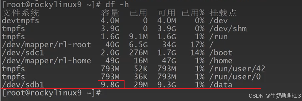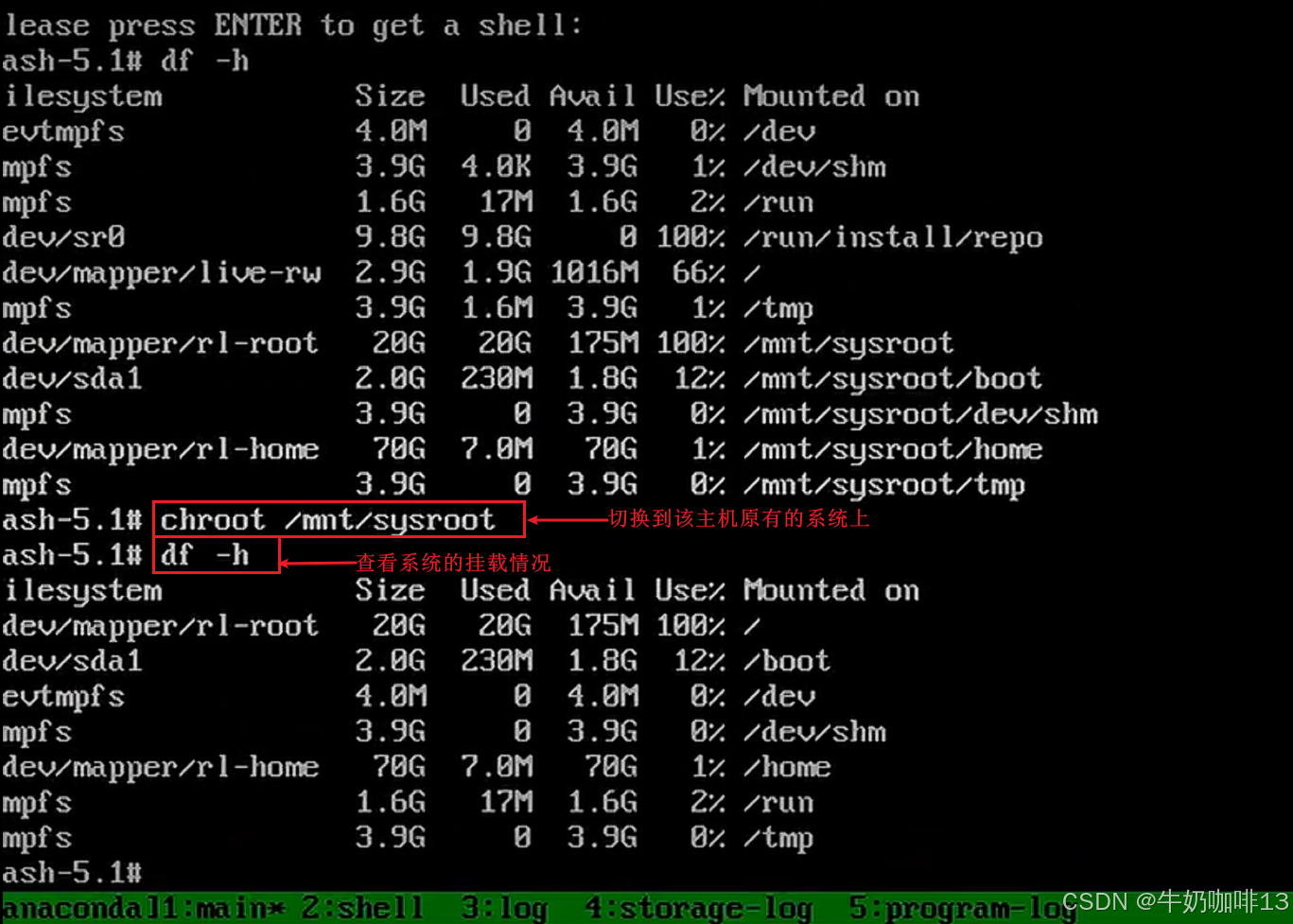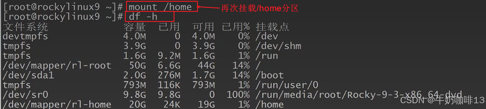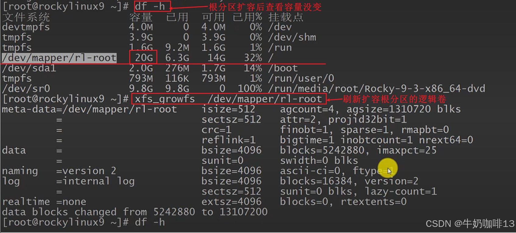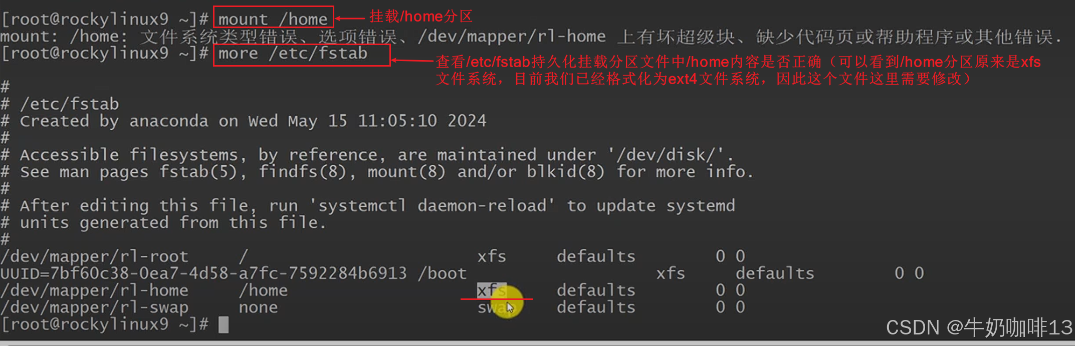 FAILED\] Failed to start GNOME Display Manager. See 'systemctl status gdm.service' for details. "的错误信息,如下图所示:  ## 二、思路分析 ### 2.1、系统无法正常启动的常规思路 一般来说,系统无法正常启动,我们都可以使用该系统的iso镜像文件通过系统启动U盘或PXE引导进入【系统救援模式】中来分析查看具体的错误详情。进入系统救援模式的步骤: 《1》主机上电后不停按下F2键选择系统启动U盘或PXE启动进入引导菜单后选择【Troubleshooting】后按下Enter键--\>【Rescue a Rocky Linux system】后按下Enter键--\>输入【1】后按下Enter键以读写模式进入系统救援模式,可以看到错误信息"dasbus.error.DBusError: \[Errno 28\] No space left on device: '/proc/self/mounts'-\>'/mnt/sysimage/etc/mtab'"(即:设备没有空间,内容没法写入和操作,因为没有存储空间导致系统不能正常启动进入的,只有一种情况就是根分区的空间满了,其他分区的空间满了对于系统启动没有什么影响;既然现在以读写模式进入系统救援模式后无法操作,那我们就以只读模式进入系统救援模式在操作看看)。 《2》重启主机后一样的操作不停按下F2键选择系统启动U盘或PXE启动进入引导菜单后选择【Troubleshooting】后按下Enter键--\>【Rescue a Rocky Linux system】后按下Enter键--\>在系统界面输入【2】后以只读模式进入系统救援模式(模式是两套系统【救援模式的系统类似windows pe】【本主机的原有系统被挂载到 /mnt/sysroot 目录下】;若想要将原系统如正常启动的系统一样的挂载使用则运行 chroot /mnt/sysroot 命令即可);执行【df -hT】可以查看系统当前的所有内容挂载情况(可以看到该主机的原系统根分区使用是100%)。       ### 2.2、系统故障分析确认 在系统救援模式下,使用【chroot /mnt/sysroot】命令切换到该主机系统上后,可以运行【df -hT】先查看所有分区的挂载与使用情况,可以看到当前系统的根分区使用率已经到达100%,与我们最开始预测的根分区满了的推测一致;接下来的操作就是排查根分区中哪个内容是占用空间较大且可以删除的即可解决问题:  ### 2.3、修复故障 排查根分区中哪个内容是占用空间较大且可以删除的: 《1》先查看根分区中占用空间的情况命令是【du -sh ./\*】; 《2》进入这个占用空间较大的目录(如/mnt)中继续执行查看占用空间情况命令【du -sh ./\*】(排查到时swapfile1文件占用空间最大到达15G,且这个文件是用作物理内存不够交换使用的,分的太大了,可以直接删除,但目前是只读文件系统,无法删除文件); 《3》既然当前有问题的根分区是以只读模式挂载的,那么修改为读写模式挂载【mount -o remount,rw /】后再执行文件删除操作即可,然后再次查看系统的所有挂载分区使用情况【df -hT】可以看到根分区已经空闲出15G空间出来使用正常了。 《4》退出当前模式【exit】并重启系统【reboot -f】查看系统是否可以启动后正常进入系统使用。        **到这里恭喜你,故障修复完成,可以成功进入系统中了。** ## 三、隐患解决 ### 3.1、系统隐患问题 虽然目前已经将根分区满的问题暂时解决了,但目前系统的根分区是不合理的(并没有将【/var】【/log】独立出来,都是糅合在根分区上)且目前根分区只有20GB,空间容量也不大,在后续的使用过程中还是会存在根分区空间又满的情况。 ### 3.2、逻辑卷LVM分区的缩容与扩容 [Linux的磁盘存储管理实操------(下一)------标准分区扩容https://coffeemilk.blog.csdn.net/article/details/149533061](https://coffeemilk.blog.csdn.net/article/details/149533061 "Linux的磁盘存储管理实操——(下一)——标准分区扩容")[Linux的磁盘存储管理实操------(下二)------逻辑卷管理LVM的扩容、缩容https://coffeemilk.blog.csdn.net/article/details/149632228](https://coffeemilk.blog.csdn.net/article/details/149632228 "Linux的磁盘存储管理实操——(下二)——逻辑卷管理LVM的扩容、缩容") 查看该主机当前的分区情况(可以看到/home的空间容量较大,剩余空间很多),在没有新增硬盘的基础上实现对根分区的扩容。 《1》LVM且文件系统格式为xfs只能在线扩容,不能缩容; 《2》LVM且文件系统格式为ext4则可以在线缩容和扩容。 而这里的/home分区是xfs格式的,就只能先将该分区的数据备份,然后卸载,接着格式化后操作了。 [Linux系统的常用操作命令------文件远程传输、文件编辑、软件安装的四种方式https://blog.csdn.net/xiaochenXIHUA/article/details/149136931](https://blog.csdn.net/xiaochenXIHUA/article/details/149136931 "Linux系统的常用操作命令——文件远程传输、文件编辑、软件安装的四种方式") [Linux中rsync数据镜像工具的解析与应用实战https://coffeemilk.blog.csdn.net/article/details/150115015](https://coffeemilk.blog.csdn.net/article/details/150115015 "Linux中rsync数据镜像工具的解析与应用实战")[Linux的压缩与解压缩https://coffeemilk.blog.csdn.net/article/details/149109326](https://coffeemilk.blog.csdn.net/article/details/149109326 "Linux的压缩与解压缩")[syncthing的配置使用https://blog.csdn.net/xiaochenXIHUA/article/details/155027993](https://blog.csdn.net/xiaochenXIHUA/article/details/155027993 "syncthing的配置使用")[国产统信UOS专业版桌面、服务器系统的安装部署、备份与还原实践保姆级教程https://coffeemilk.blog.csdn.net/article/details/155530808](https://coffeemilk.blog.csdn.net/article/details/155530808 "国产统信UOS专业版桌面、服务器系统的安装部署、备份与还原实践保姆级教程") ```bash #对LVM(逻辑卷管理)的/home分区进行缩容操作;并对LVM管