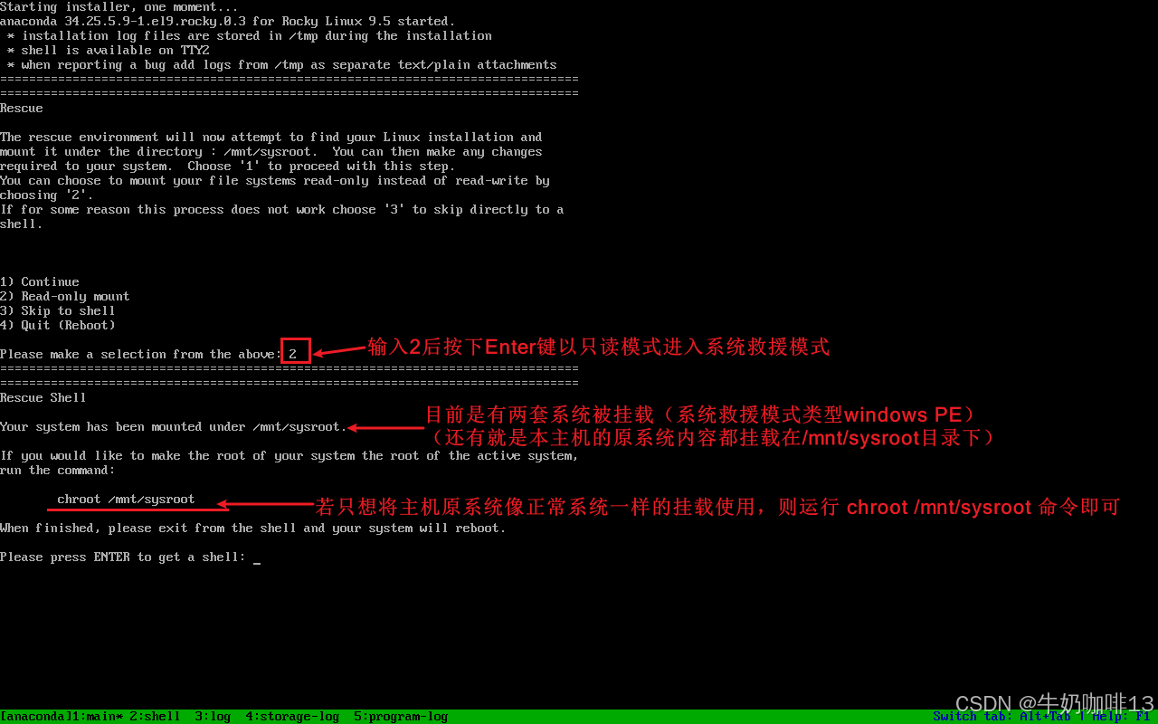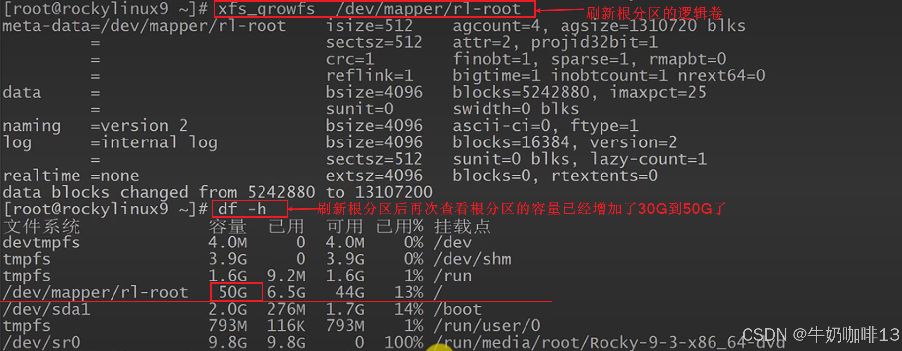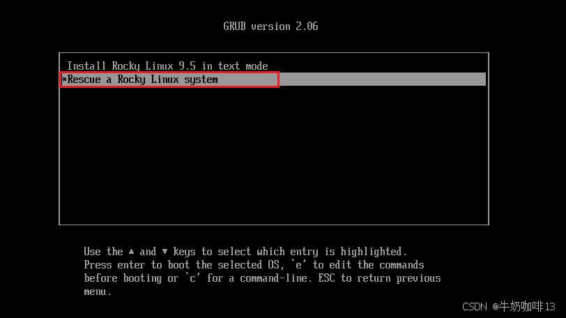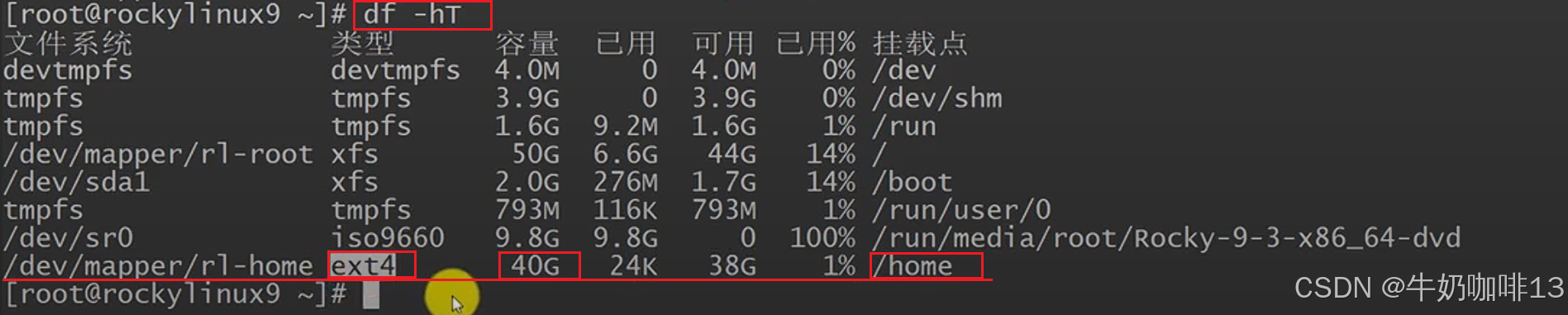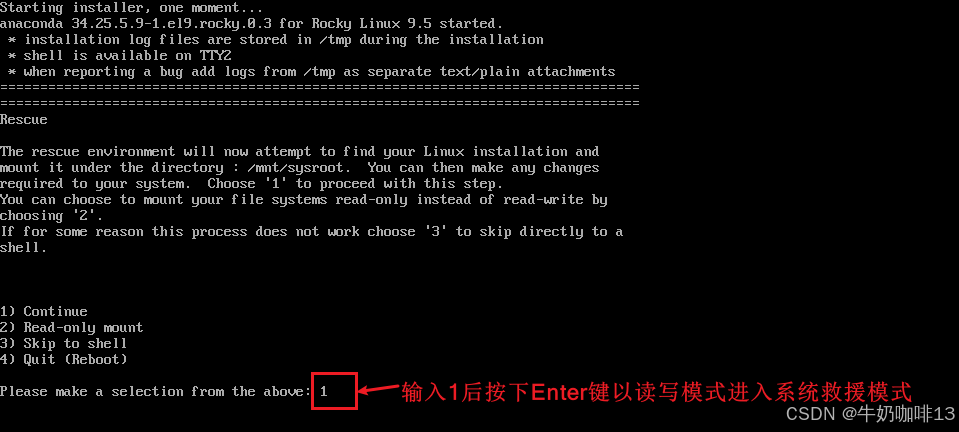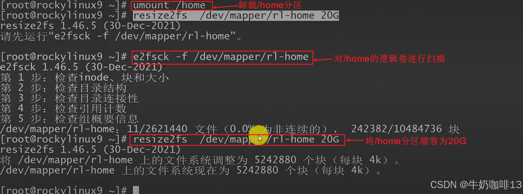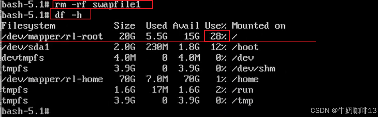 FAILED\] Failed to start GNOME Display Manager. See 'systemctl status gdm.service' for details. "的错误信息,如下图所示:  ## 二、思路分析 ### 2.1、系统无法正常启动的常规思路 一般来说,系统无法正常启动,我们都可以使用该系统的iso镜像文件通过系统启动U盘或PXE引导进入【系统救援模式】中来分析查看具体的错误详情。进入系统救援模式的步骤: 《1》主机上电后不停按下F2键选择系统启动U盘或PXE启动进入引导菜单后选择【Troubleshooting】后按下Enter键--\>【Rescue a Rocky Linux system】后按下Enter键--\>输入【1】后按下Enter键以读写模式进入系统救援模式,可以看到错误信息"dasbus.error.DBusError: \[Errno 28\] No space left on device: '/proc/self/mounts'-\>'/mnt/sysimage/etc/mtab'"(即:设备没有空间,内容没法写入和操作,因为没有存储空间导致系统不能正常启动进入的,只有一种情况就是根分区的空间满了,其他分区的空间满了对于系统启动没有什么影响;既然现在以读写模式进入系统救援模式后无法操作,那我们就以只读模式进入系统救援模式在操作看看)。 《2》重启主机后一样的操作不停按下F2键选择系统启动U盘或PXE启动进入引导菜单后选择【Troubleshooting】后按下Enter键--\>【Rescue a Rocky Linux system】后按下Enter键--\>在系统界面输入【2】后以只读模式进入系统救援模式(模式是两套系统【救援模式的系统类似windows pe】【本主机的原有系统被挂载到 /mnt/sysroot 目录下】;若想要将原系统如正常启动的系统一样的挂载使用则运行 chroot /mnt/sysroot 命令即可);执行【df -hT】可以查看系统当前的所有内容挂载情况(可以看到该主机的原系统根分区使用是100%)。       ### 2.2、系统故障分析确认 在系统救援模式下,使用【chroot /mnt/sysroot】命令切换到该主机系统上后,可以运行【df -hT】先查看所有分区的挂载与使用情况,可以看到当前系统的根分区使用率已经到达100%,与我们最开始预测的根分区满了的推测一致;接下来的操作就是排查根分区中哪个内容是占用空间较大且可以删除的即可解决问题:  ### 2.3、修复故障 排查根分区中哪个内容是占用空间较大且可以删除的: 《1》先查看根分区中占用空间的情况命令是【du -sh ./\*】; 《2》进入这个占用空间较大的目录(如/mnt)中继续执行查看占用空间情况命令【du -sh ./\*】(排查到时swapfile1文件占用空间最大到达15G,且这个文件是用作物理内存不够交换使用的,分的太大了,可以直接删除,但目前是只读文件系统,无法删除文件); 《3》既然当前有问题的根分区是以只读模式挂载的,那么修改为读写模式挂载【mount -o remount,rw /】后再执行文件删除操作即可,然后再次查看系统的所有挂载分区使用情况【df -hT】可以看到根分区已经空闲出15G空间出来使用正常了。 《4》退出当前模式【exit】并重启系统【reboot -f】查看系统是否可以启动后正常进入系统使用。        **到这里恭喜你,故障修复完成,可以成功进入系统中了。** ## 三、隐患解决 ### 3.1、系统隐患问题 虽然目前已经将根分区满的问题暂时解决了,但目前系统的根分区是不合理的(并没有将【/var】【/log】独立出来,都是糅合在根分区上)且目前根分区只有20GB,空间容量也不大,在后续的使用过程中还是会存在根分区空间又满的情况。 ### 3.2、逻辑卷LVM分区的缩容与扩容 [Linux的磁盘存储管理实操------(下一)------标准分区扩容https://coffeemilk.blog.csdn.net/article/details/149533061](https://coffeemilk.blog.csdn.net/article/details/149533061 "Linux的磁盘存储管理实操——(下一)——标准分区扩容")[Linux的磁盘存储管理实操------(下二)------逻辑卷管理LVM的扩容、缩容https://coffeemilk.blog.csdn.net/article/details/149632228](https://coffeemilk.blog.csdn.net/article/details/149632228 "Linux的磁盘存储管理实操——(下二)——逻辑卷管理LVM的扩容、缩容") 查看该主机当前的分区情况(可以看到/home的空间容量较大,剩余空间很多),在没有新增硬盘的基础上实现对根分区的扩容。 《1》LVM且文件系统格式为xfs只能在线扩容,不能缩容; 《2》LVM且文件系统格式为ext4则可以在线缩容和扩容。 而这里的/home分区是xfs格式的,就只能先将该分区的数据备份,然后卸载,接着格式化后操作了。 [Linux系统的常用操作命令------文件远程传输、文件编辑、软件安装的四种方式https://blog.csdn.net/xiaochenXIHUA/article/details/149136931](https://blog.csdn.net/xiaochenXIHUA/article/details/149136931 "Linux系统的常用操作命令——文件远程传输、文件编辑、软件安装的四种方式") [Linux中rsync数据镜像工具的解析与应用实战https://coffeemilk.blog.csdn.net/article/details/150115015](https://coffeemilk.blog.csdn.net/article/details/150115015 "Linux中rsync数据镜像工具的解析与应用实战")[Linux的压缩与解压缩https://coffeemilk.blog.csdn.net/article/details/149109326](https://coffeemilk.blog.csdn.net/article/details/149109326 "Linux的压缩与解压缩")[syncthing的配置使用https://blog.csdn.net/xiaochenXIHUA/article/details/155027993](https://blog.csdn.net/xiaochenXIHUA/article/details/155027993 "syncthing的配置使用")[国产统信UOS专业版桌面、服务器系统的安装部署、备份与还原实践保姆级教程https://coffeemilk.blog.csdn.net/article/details/155530808](https://coffeemilk.blog.csdn.net/article/details/155530808 "国产统信UOS专业版桌面、服务器系统的安装部署、备份与还原实践保姆级教程") ```bash #对LVM(逻辑卷管理)的/home分区进行缩容操作;并对LVM管
