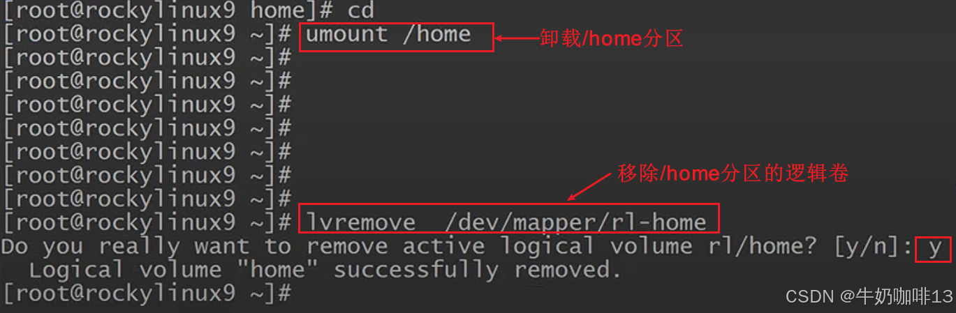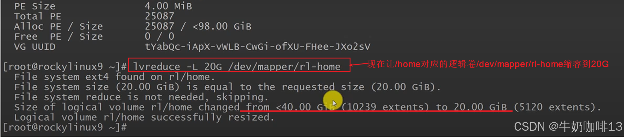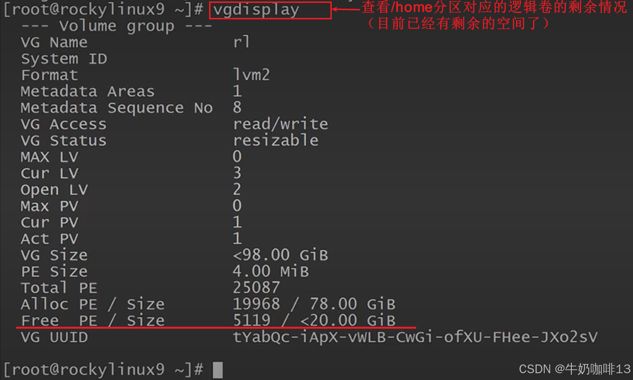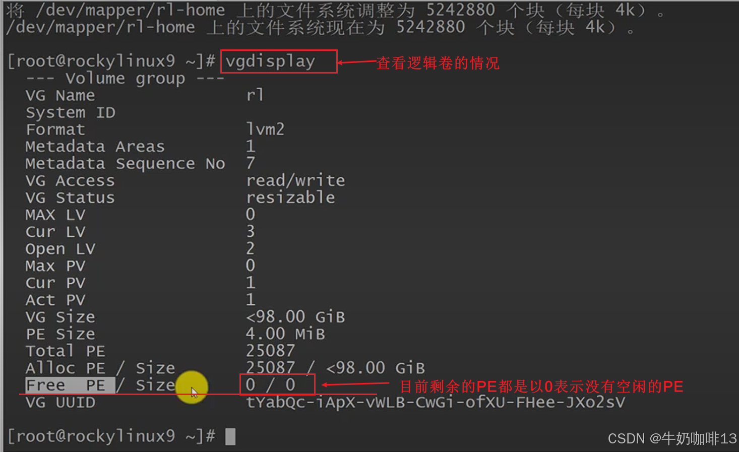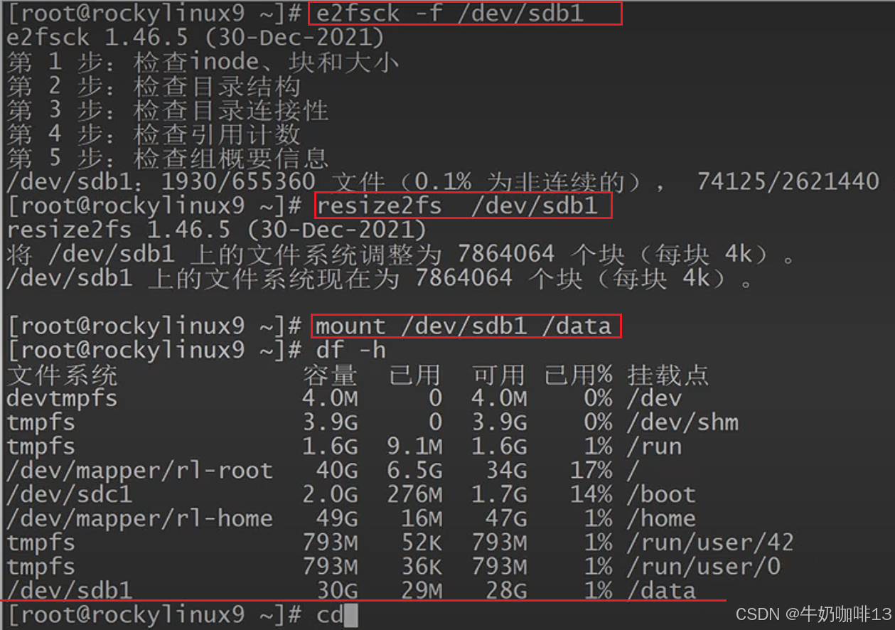 FAILED\] Failed to start GNOME Display Manager. See 'systemctl status gdm.service' for details. "的错误信息,如下图所示:  ## 二、思路分析 ### 2.1、系统无法正常启动的常规思路 一般来说,系统无法正常启动,我们都可以使用该系统的iso镜像文件通过系统启动U盘或PXE引导进入【系统救援模式】中来分析查看具体的错误详情。进入系统救援模式的步骤: 《1》主机上电后不停按下F2键选择系统启动U盘或PXE启动进入引导菜单后选择【Troubleshooting】后按下Enter键--\>【Rescue a Rocky Linux system】后按下Enter键--\>输入【1】后按下Enter键以读写模式进入系统救援模式,可以看到错误信息"dasbus.error.DBusError: \[Errno 28\] No space left on device: '/proc/self/mounts'-\>'/mnt/sysimage/etc/mtab'"(即:设备没有空间,内容没法写入和操作,因为没有存储空间导致系统不能正常启动进入的,只有一种情况就是根分区的空间满了,其他分区的空间满了对于系统启动没有什么影响;既然现在以读写模式进入系统救援模式后无法操作,那我们就以只读模式进入系统救援模式在操作看看)。 《2》重启主机后一样的操作不停按下F2键选择系统启动U盘或PXE启动进入引导菜单后选择【Troubleshooting】后按下Enter键--\>【Rescue a Rocky Linux system】后按下Enter键--\>在系统界面输入【2】后以只读模式进入系统救援模式(模式是两套系统【救援模式的系统类似windows pe】【本主机的原有系统被挂载到 /mnt/sysroot 目录下】;若想要将原系统如正常启动的系统一样的挂载使用则运行 chroot /mnt/sysroot 命令即可);执行【df -hT】可以查看系统当前的所有内容挂载情况(可以看到该主机的原系统根分区使用是100%)。       ### 2.2、系统故障分析确认 在系统救援模式下,使用【chroot /mnt/sysroot】命令切换到该主机系统上后,可以运行【df -hT】先查看所有分区的挂载与使用情况,可以看到当前系统的根分区使用率已经到达100%,与我们最开始预测的根分区满了的推测一致;接下来的操作就是排查根分区中哪个内容是占用空间较大且可以删除的即可解决问题:  ### 2.3、修复故障 排查根分区中哪个内容是占用空间较大且可以删除的: 《1》先查看根分区中占用空间的情况命令是【du -sh ./\*】; 《2》进入这个占用空间较大的目录(如/mnt)中继续执行查看占用空间情况命令【du -sh ./\*】(排查到时swapfile1文件占用空间最大到达15G,且这个文件是用作物理内存不够交换使用的,分的太大了,可以直接删除,但目前是只读文件系统,无法删除文件); 《3》既然当前有问题的根分区是以只读模式挂载的,那么修改为读写模式挂载【mount -o remount,rw /】后再执行文件删除操作即可,然后再次查看系统的所有挂载分区使用情况【df -hT】可以看到根分区已经空闲出15G空间出来使用正常了。 《4》退出当前模式【exit】并重启系统【reboot -f】查看系统是否可以启动后正常进入系统使用。        **到这里恭喜你,故障修复完成,可以成功进入系统中了。** ## 三、隐患解决 ### 3.1、系统隐患问题 虽然目前已经将根分区满的问题暂时解决了,但目前系统的根分区是不合理的(并没有将【/var】【/log】独立出来,都是糅合在根分区上)且目前根分区只有20GB,空间容量也不大,在后续的使用过程中还是会存在根分区空间又满的情况。 ### 3.2、逻辑卷LVM分区的缩容与扩容 [Linux的磁盘存储管理实操------(下一)------标准分区扩容https://coffeemilk.blog.csdn.net/article/details/149533061](https://coffeemilk.blog.csdn.net/article/details/149533061 "Linux的磁盘存储管理实操——(下一)——标准分区扩容")[Linux的磁盘存储管理实操------(下二)------逻辑卷管理LVM的扩容、缩容https://coffeemilk.blog.csdn.net/article/details/149632228](https://coffeemilk.blog.csdn.net/article/details/149632228 "Linux的磁盘存储管理实操——(下二)——逻辑卷管理LVM的扩容、缩容") 查看该主机当前的分区情况(可以看到/home的空间容量较大,剩余空间很多),在没有新增硬盘的基础上实现对根分区的扩容。 《1》LVM且文件系统格式为xfs只能在线扩容,不能缩容; 《2》LVM且文件系统格式为ext4则可以在线缩容和扩容。 而这里的/home分区是xfs格式的,就只能先将该分区的数据备份,然后卸载,接着格式化后操作了。 [Linux系统的常用操作命令------文件远程传输、文件编辑、软件安装的四种方式https://blog.csdn.net/xiaochenXIHUA/article/details/149136931](https://blog.csdn.net/xiaochenXIHUA/article/details/149136931 "Linux系统的常用操作命令——文件远程传输、文件编辑、软件安装的四种方式") [Linux中rsync数据镜像工具的解析与应用实战https://coffeemilk.blog.csdn.net/article/details/150115015](https://coffeemilk.blog.csdn.net/article/details/150115015 "Linux中rsync数据镜像工具的解析与应用实战")[Linux的压缩与解压缩https://coffeemilk.blog.csdn.net/article/details/149109326](https://coffeemilk.blog.csdn.net/article/details/149109326 "Linux的压缩与解压缩")[syncthing的配置使用https://blog.csdn.net/xiaochenXIHUA/article/details/155027993](https://blog.csdn.net/xiaochenXIHUA/article/details/155027993 "syncthing的配置使用")[国产统信UOS专业版桌面、服务器系统的安装部署、备份与还原实践保姆级教程https://coffeemilk.blog.csdn.net/article/details/155530808](https://coffeemilk.blog.csdn.net/article/details/155530808 "国产统信UOS专业版桌面、服务器系统的安装部署、备份与还原实践保姆级教程") ```bash #对LVM(逻辑卷管理)的/home分区进行缩容操作;并对LVM管
