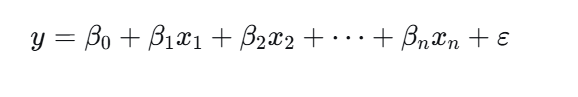 线性回归是一种通过建立自变量与因变量之间的线性关系来进行预测的统计模型。其基本形式可以表示为:y = β₀ + β₁x₁ + β₂x₂ + ... + βₙxₙ + ε。在方程中,y代表因变量(即我们希望预测的连续值),x₁, x₂, ..., xₙ代表一系列自变量(用于预测的特征),β₀, β₁, ..., βₙ是模型的参数,其中 β₀为截距,其他β值代表每个特征对目标值的影响权重,而ε则代表误差项,用于捕捉模型无法解释的随机波动。该模型的目标是找到一组最优的参数β,使得预测值ŷ与真实值y之间的误差最小。