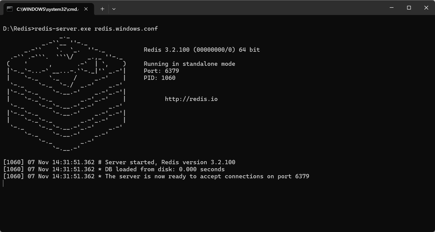 在解压后的目录下cmd,直接输入命令redis-server.exe redis.windows.conf,即可启动redis