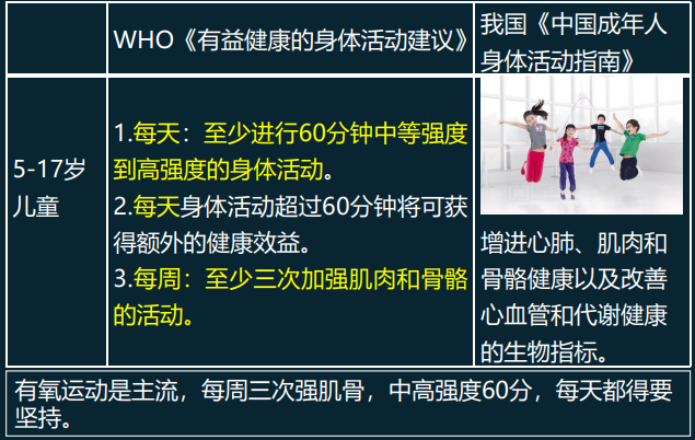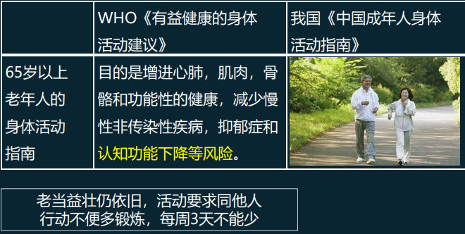 目的:增进心肺,肌肉,骨骼和功能性的健康,减少慢性非传染性疾病,抑郁症和 认知功能下降等风险。