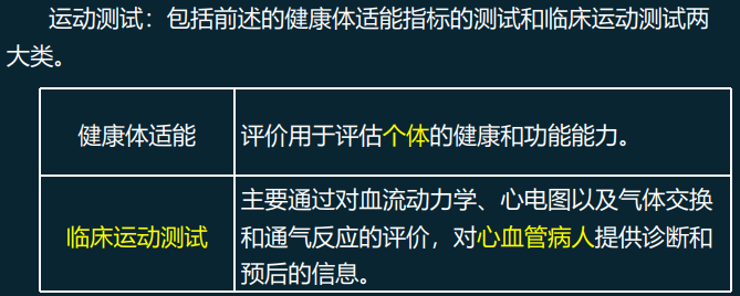 • 运动测试(必要时进行):包括前述的 健康体适能指标的测试 、临床运动测试两 大类