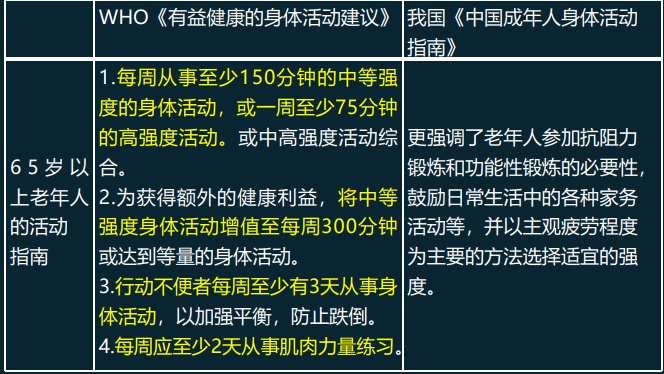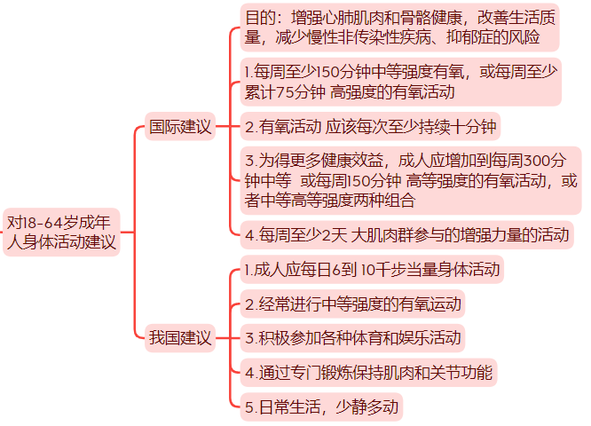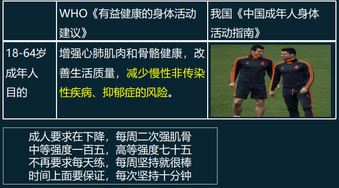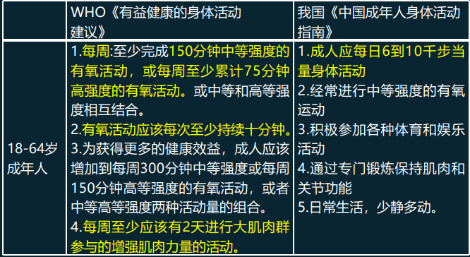 1.每周从事至少150分钟的中等强 度的身体活动,或一周至少75分钟 的高强度活动。或中高强度活动综 合。2.为获额外的健康利益,将中等 强度身体活动增值至每周300分钟 或达到等量的身体活动。