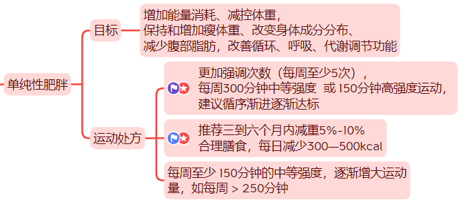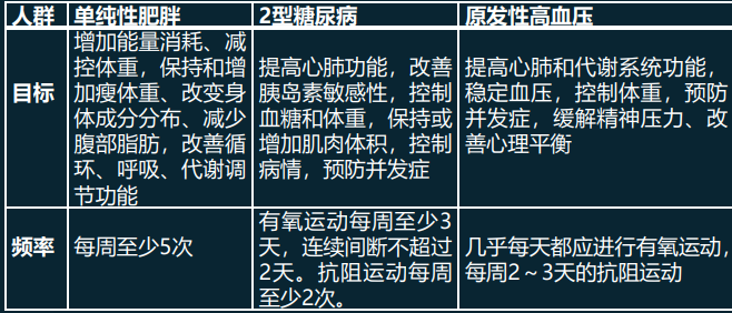 干预的目标:增加能量消耗、减控体重,保持和增加瘦体重、改 变身体成分分布、减少腹部脂肪,改善循环、呼吸、代谢调节功能。