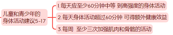 1.每天:至少进行60分钟中等强度 到高强度的身体活动。2.每天身体活动超过60分钟将可获 得额外的健康效益。