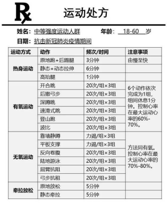 中低强度(40%-60%最大心率)有氧运动,60%-80% 的最大重复次数强度进行抗阻运动。