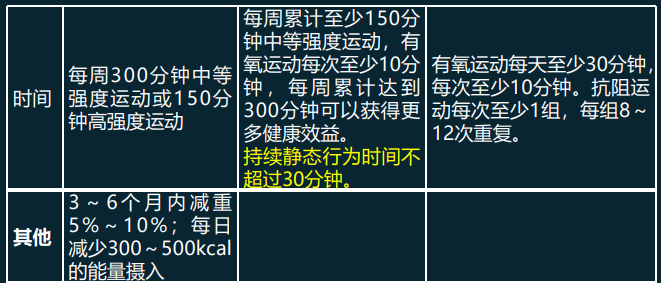 运动总量:每周300分钟中等强度运动或 150分钟高 强度运动,建议循序渐进逐渐达标