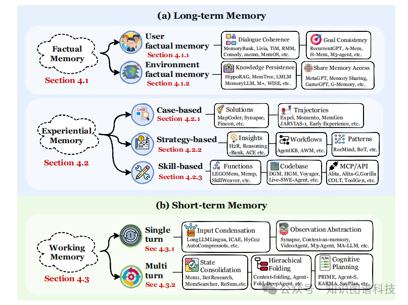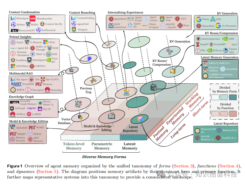 图1展示了按照"形式-功能-动态"统一分类体系组织的智能体记忆全景图,将记忆构件按其主要形式和功能定位,并映射代表性系统到此分类体系中。