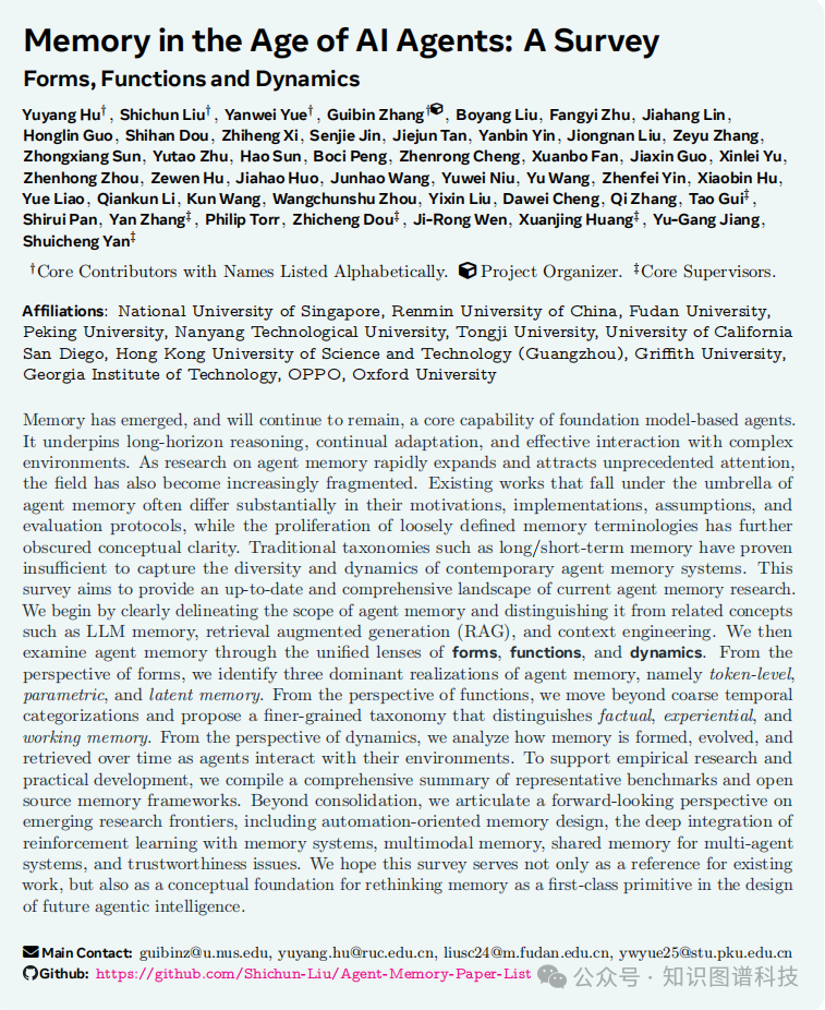 本文系统性地综述了AI智能体记忆系统的最新研究进展,提出了"形式-功能-动态"三维分类框架。研究指出记忆是基础模型驱动的智能体的核心能力,支撑长期推理、持续适应和复杂环境交互。文章深入探讨了记忆的三种主要形式、三类功能角色及其演化机制,为未来智能体研究提供了系统性的理论基础。