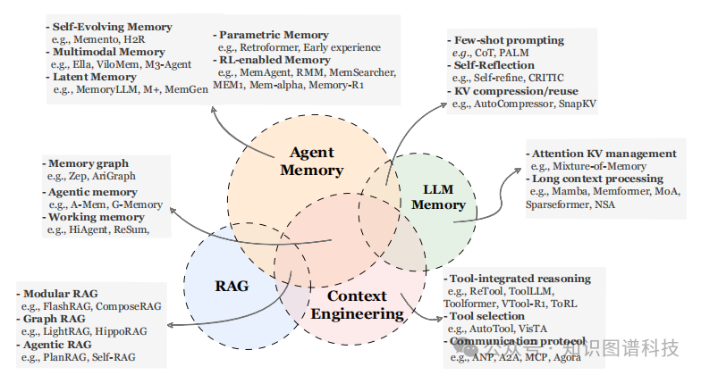 图2通过维恩图展示了智能体记忆与LLM记忆、RAG和上下文工程之间的共性与区别。
