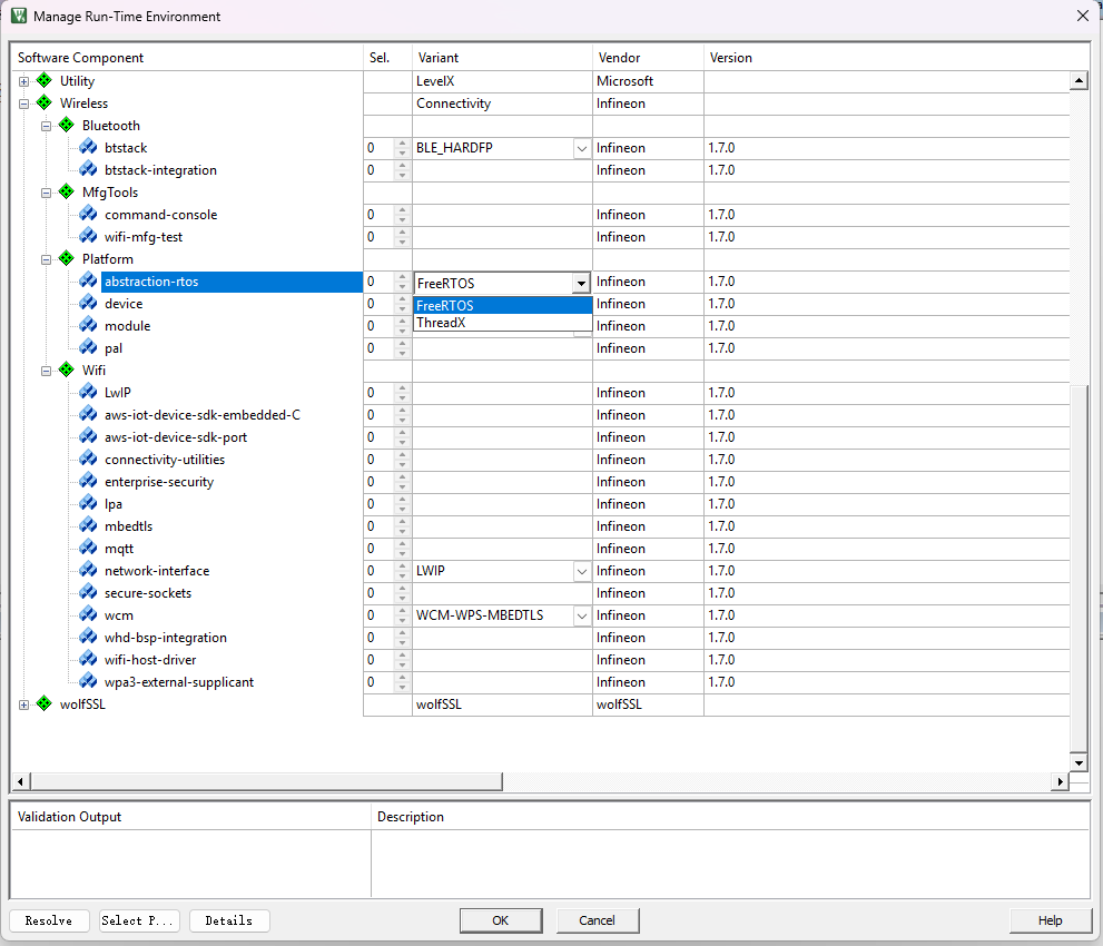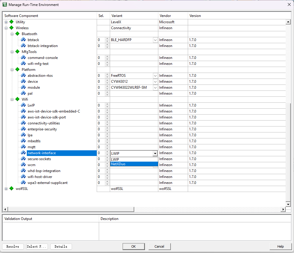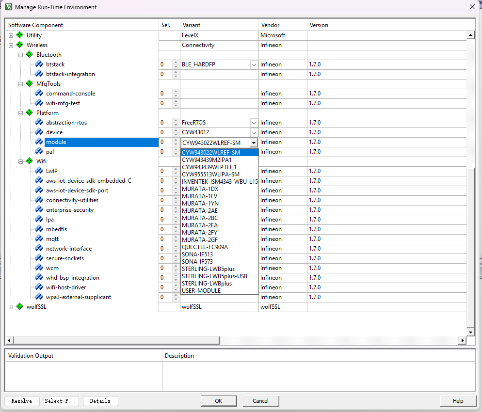 可在STM32CubeMX工具中选取并配置该扩展包,根据设计需求进行选择(例如确定使用的CYW43xxx设备类型),随后即可基于所选配置生成项目。