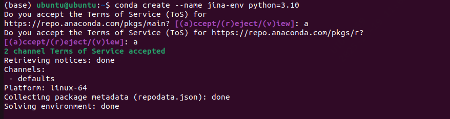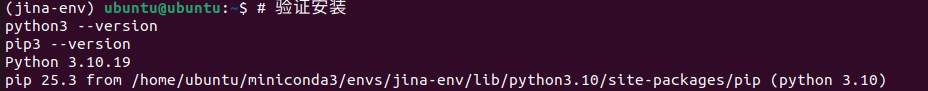 执行命令来创建一个名为 jina-env(也可以自定义其他名称)的新环境,这里我指定了python版本为3.10,大家一步到位装3.13,这里我为了引入"选择环境"更新python版本的情节,我先装了3.10便于教学,大家忽略就好