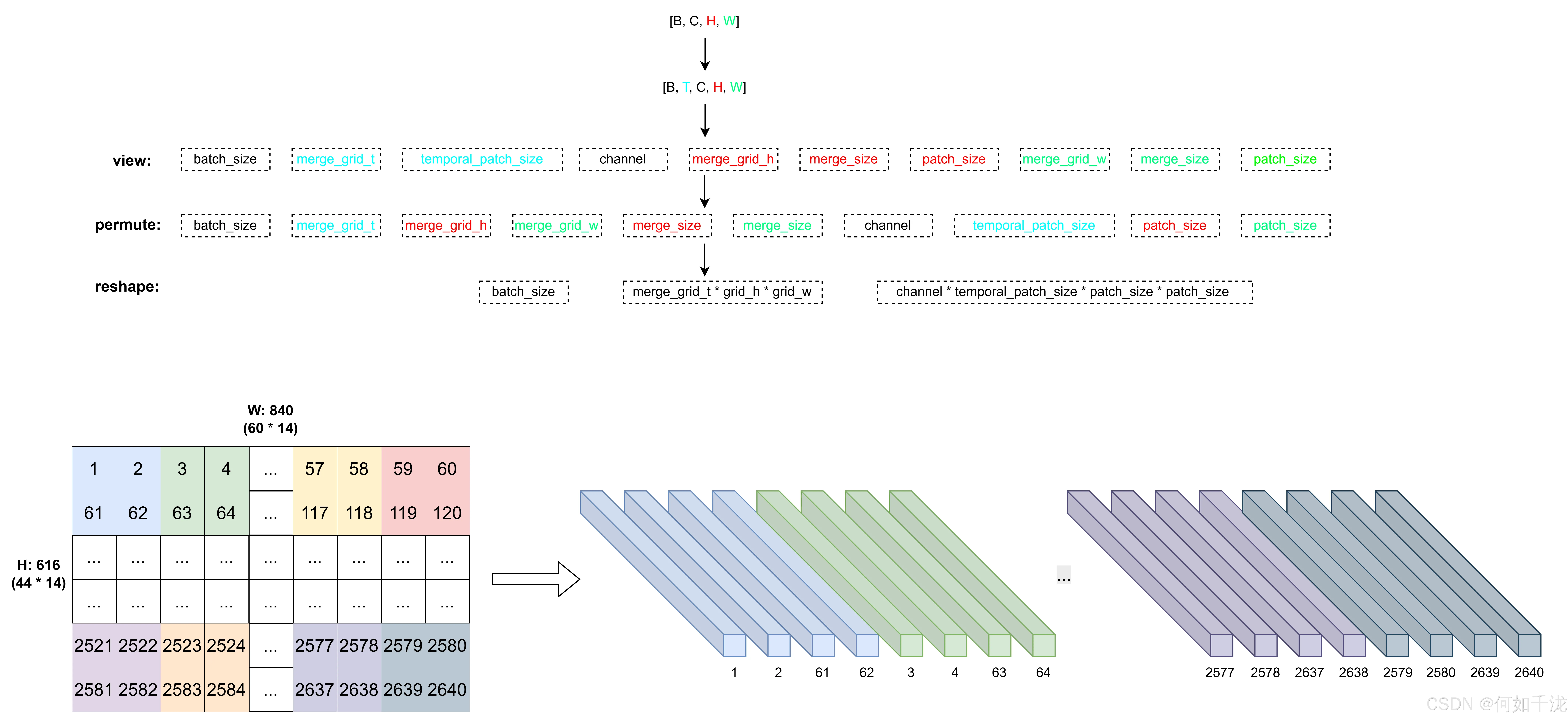 pythonpatches = patches.view( batch_size, grid_t, temporal_patch_size, channel, grid_h // merge_size, # merged grid height merge_size, # patches within one merged unit (height) patch_size, grid_w // merge_size, # merged grid width merge_size, # patches within one merged unit (width) patch_size, ) patches = patches.permute(0, 1, 4, 7, 5, 8, 3, 2, 6, 9) # -> [B, grid_t, grid_h_m, grid_w_m, merge_h, merge_w, C, T_patch, P_h, P_w] flatten_patches = patches.reshape( batch_size, grid_t * grid_h * grid_w, # 总 token 数(注意:未除 merge_size!) channel * temporal_patch_size * patch_size * patch_size, )
