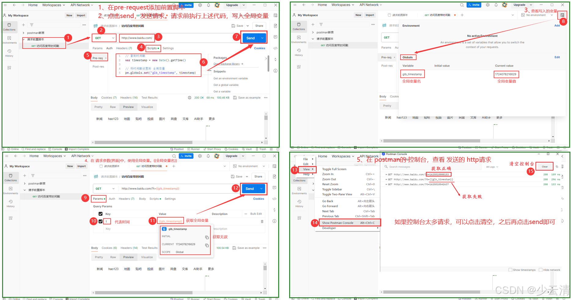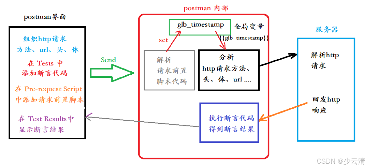 请求前置脚本就是在"Pre-request Script"标签中所编写的脚本,是在请求发送之前(send)要执行的代码片段。