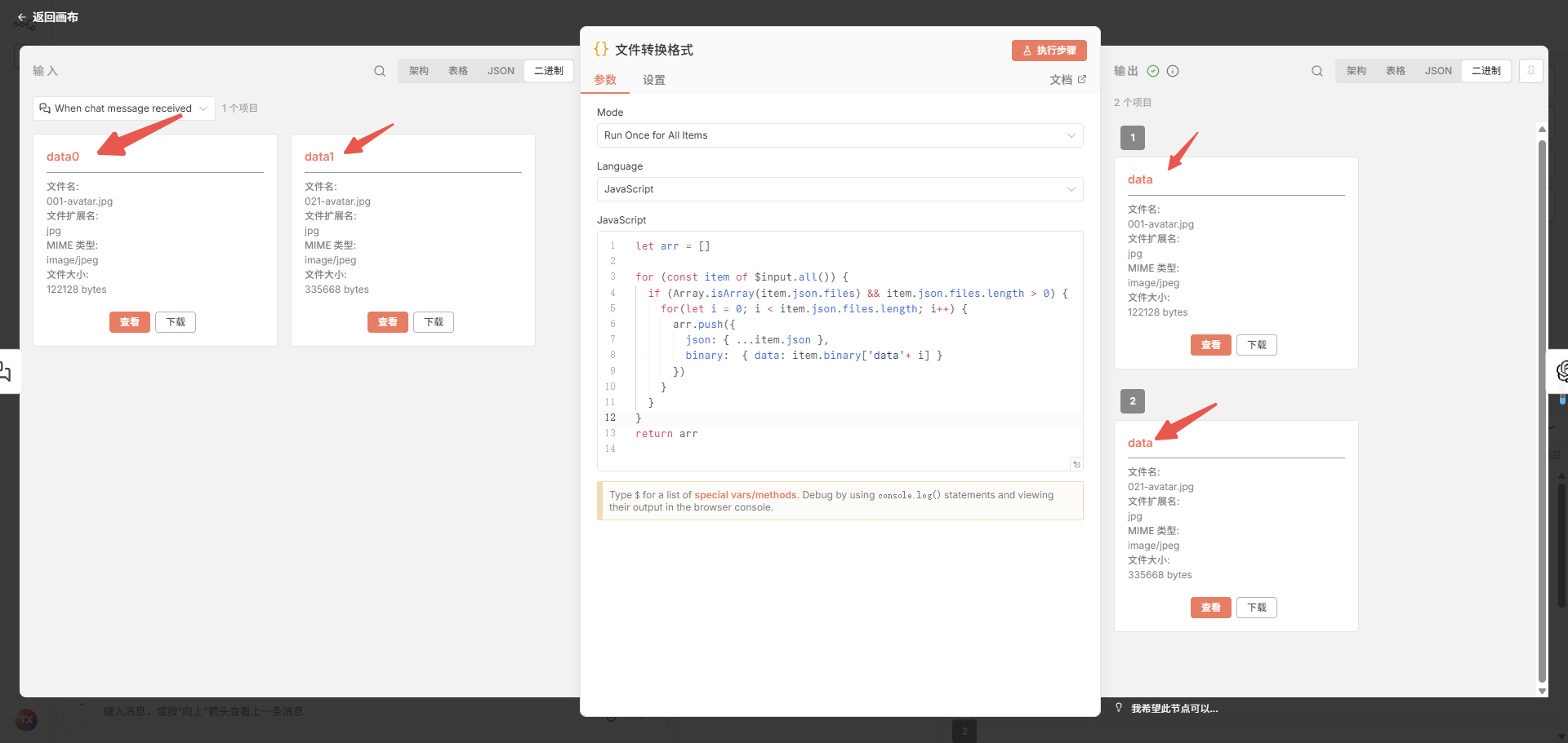 "jsCode": "let arr = []\n\nfor (const item of $input.all()) {\n if (Array.isArray(item.json.files) && item.json.files.length > 0) {\n for(let i = 0; i < item.json.files.length; i++) {\n arr.push({\n json: { ...item.json }, \n binary: { data: item.binary['data'+ i] } \n })\n }\n }\n}\nreturn arr\n"