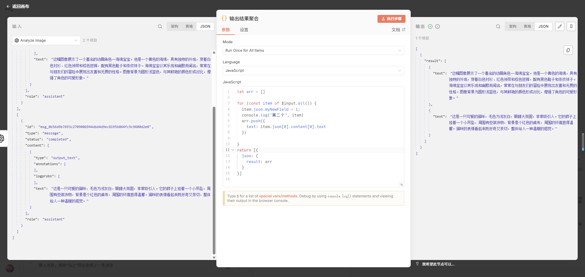 "jsCode": "let arr = []\n\nfor (const item of $input.all()) {\n item.json.myNewField = 1;\n console.log('第二个', item)\n arr.push({\n text: item.json[0].content[0].text \n })\n \n}\nreturn [{\n json: {\n result: arr\n }\n}]\n"